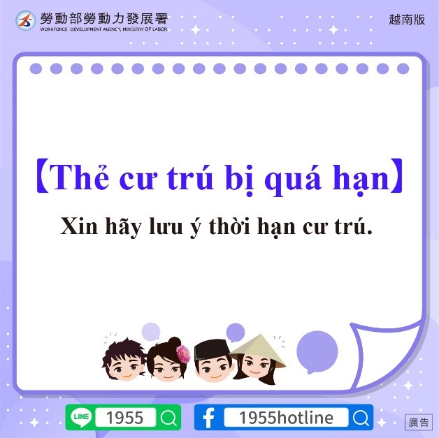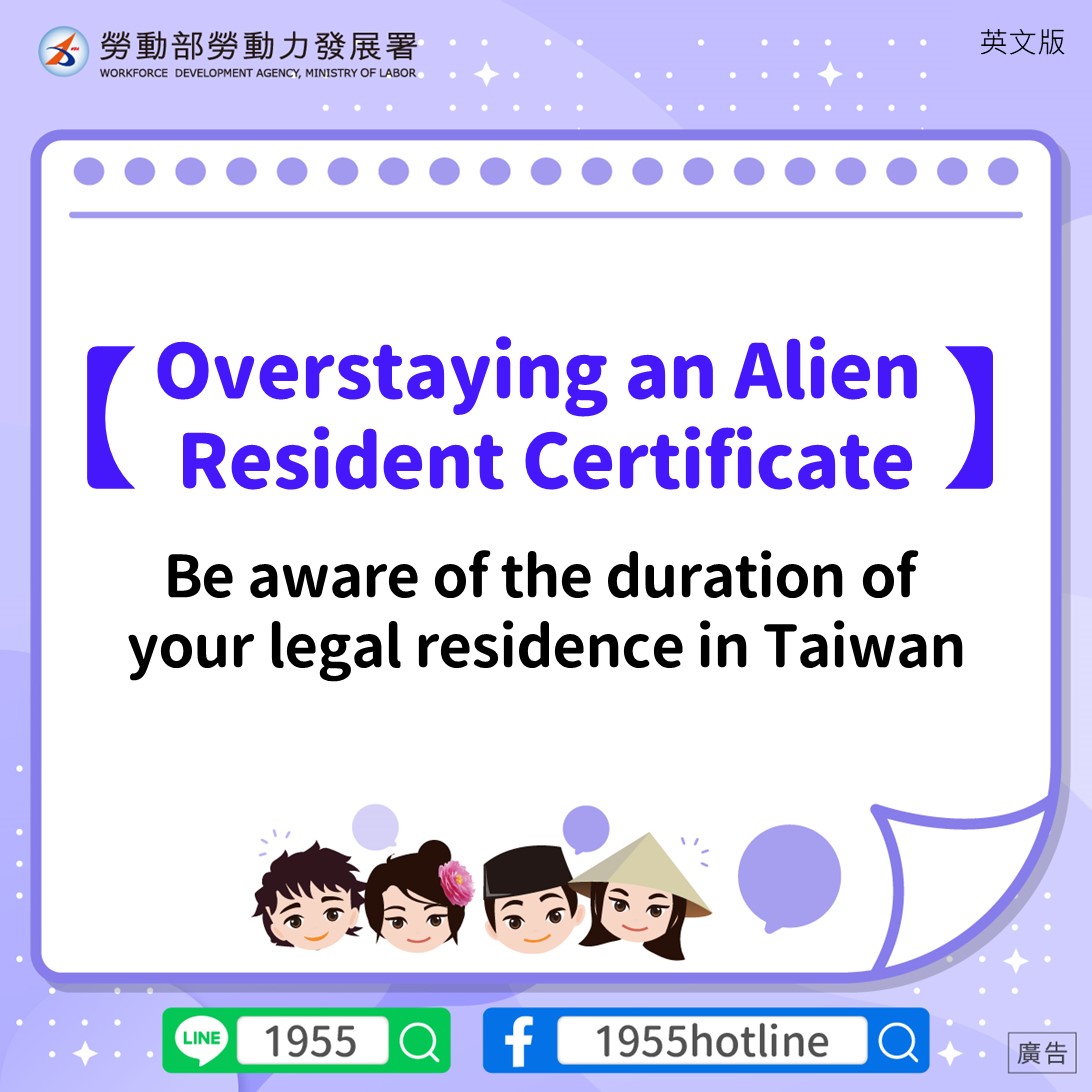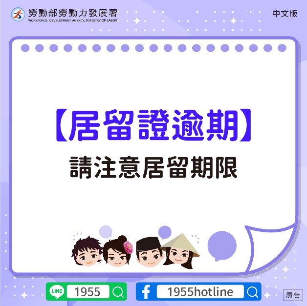 3.หากต้องการพำนักในไต้หวันต่อ โปรดแจ้งนายจ้างหรือบริษัทจัดหางานให้ช่วยดำเนินการขอต่ออายุบัตรถิ่นที่อยู่จากสำนักงานตรวจคนเข้าเมือง กระทรวงมหาดไทยไต้หวัน ก่อนวันหมดอายุ