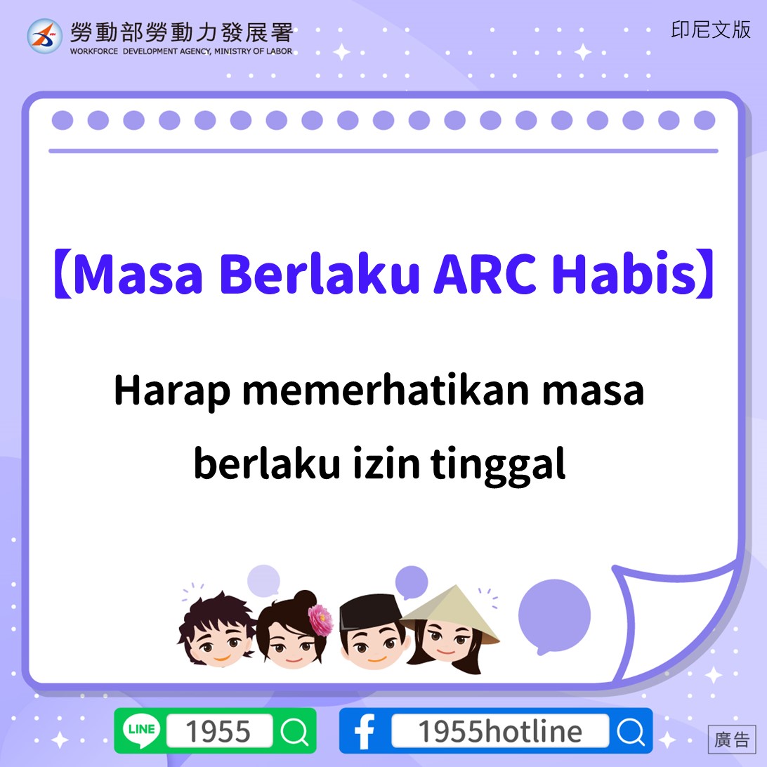 3. Apabila perlu untuk terus menetap, mohon mengingatkan majikan atau agensi Anda untuk mengajukan perpanjangan ke Direktorat Jenderal Imigrasi (NIA) Kementerian Dalam Negeri sebelum masa berlaku ARC berakhir.