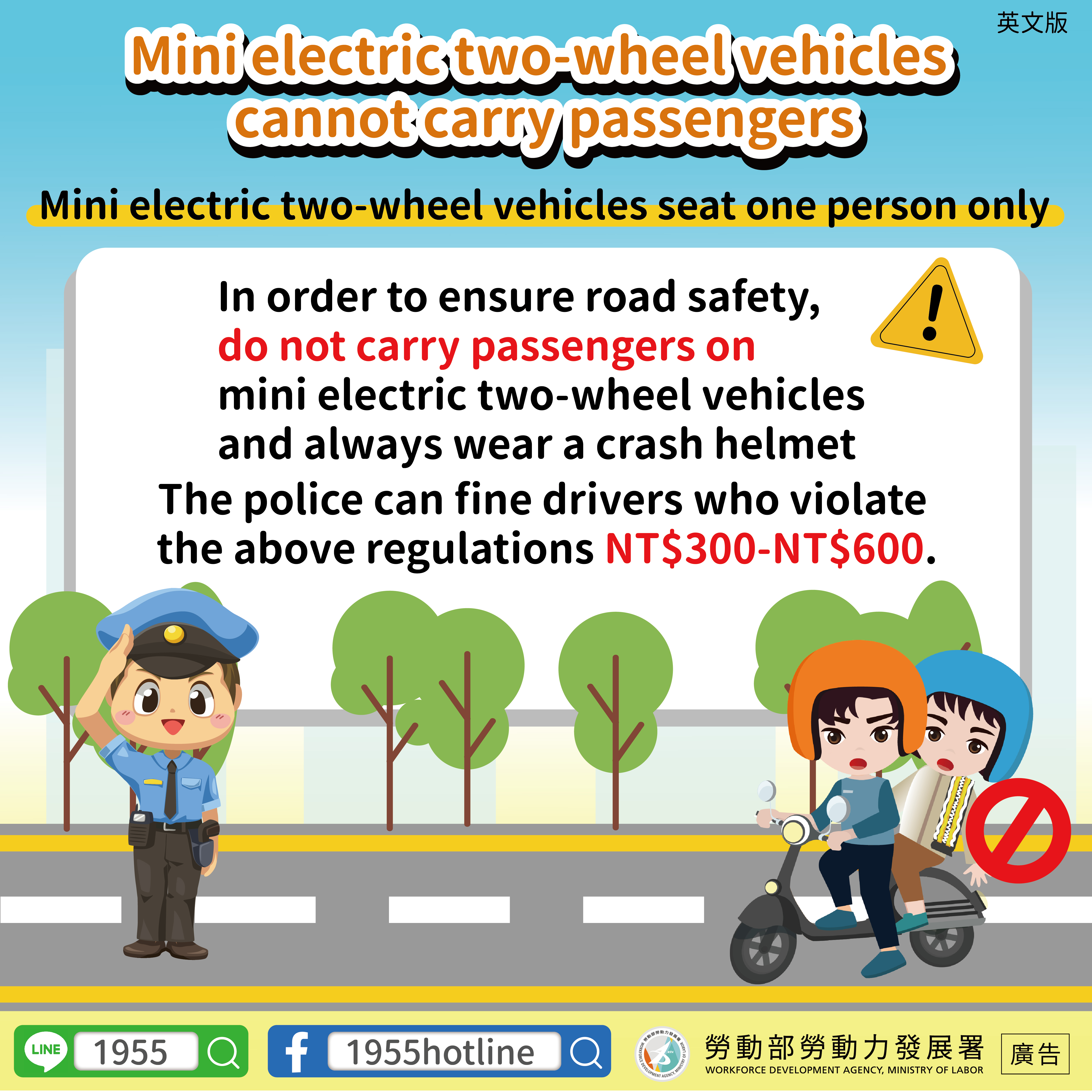 為了維護騎乘者的安全, 騎乘微型電動二輪車請勿雙載 也別忘記要戴好安全帽唷!