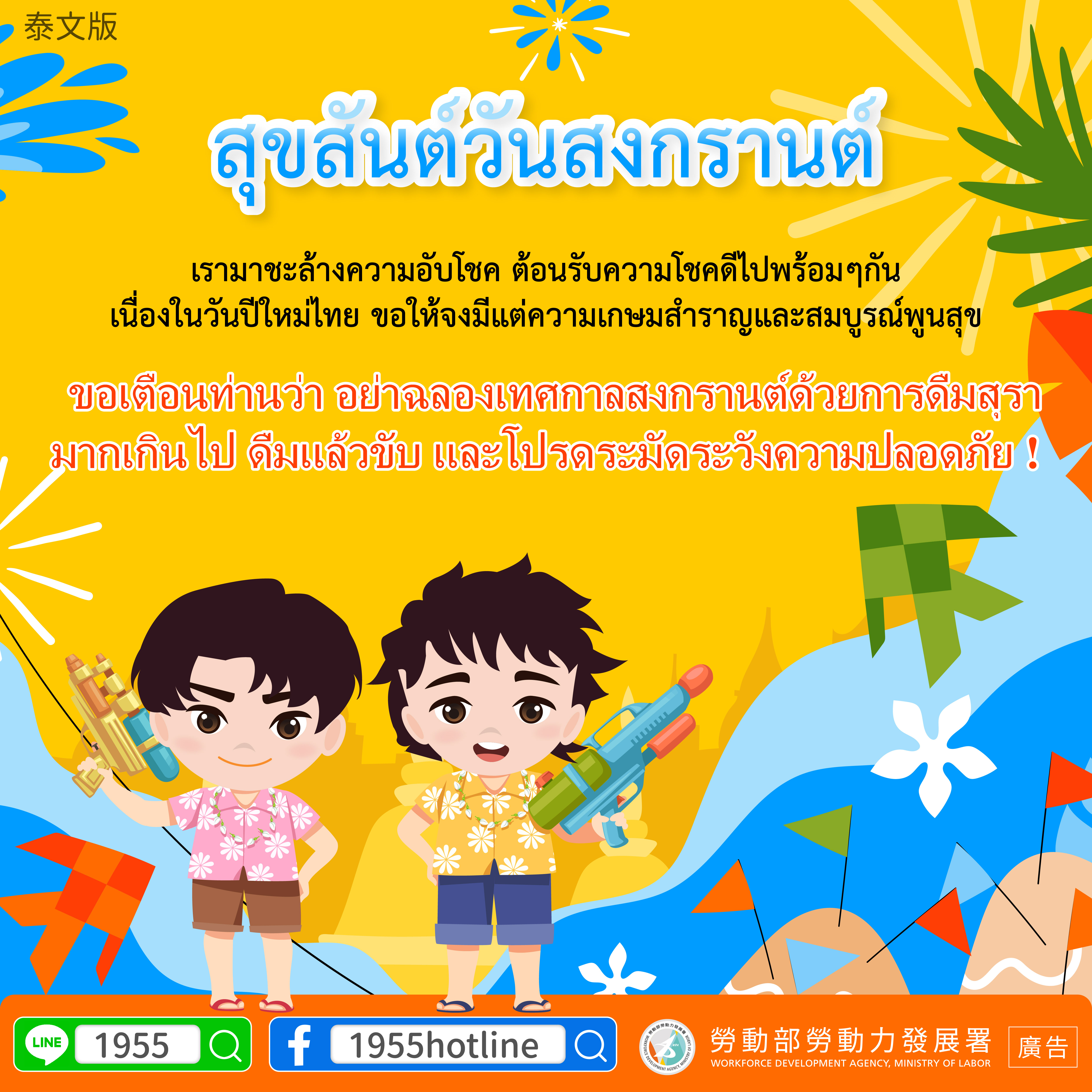 ขอเตือนท่านว่า อย่าฉลองเทศกาลสงกรานต์ด้วยการดื่มสุรามากเกินไป ดื่มแล้วขับ และโปรดระมัดระวังความปลอดภัย !