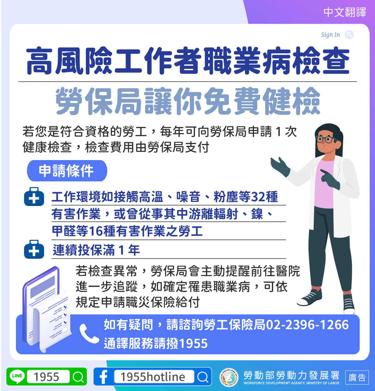 LINE@移點通-【高風險工作者職業病檢查,勞保局讓你免費健檢-保險】-多國語言版