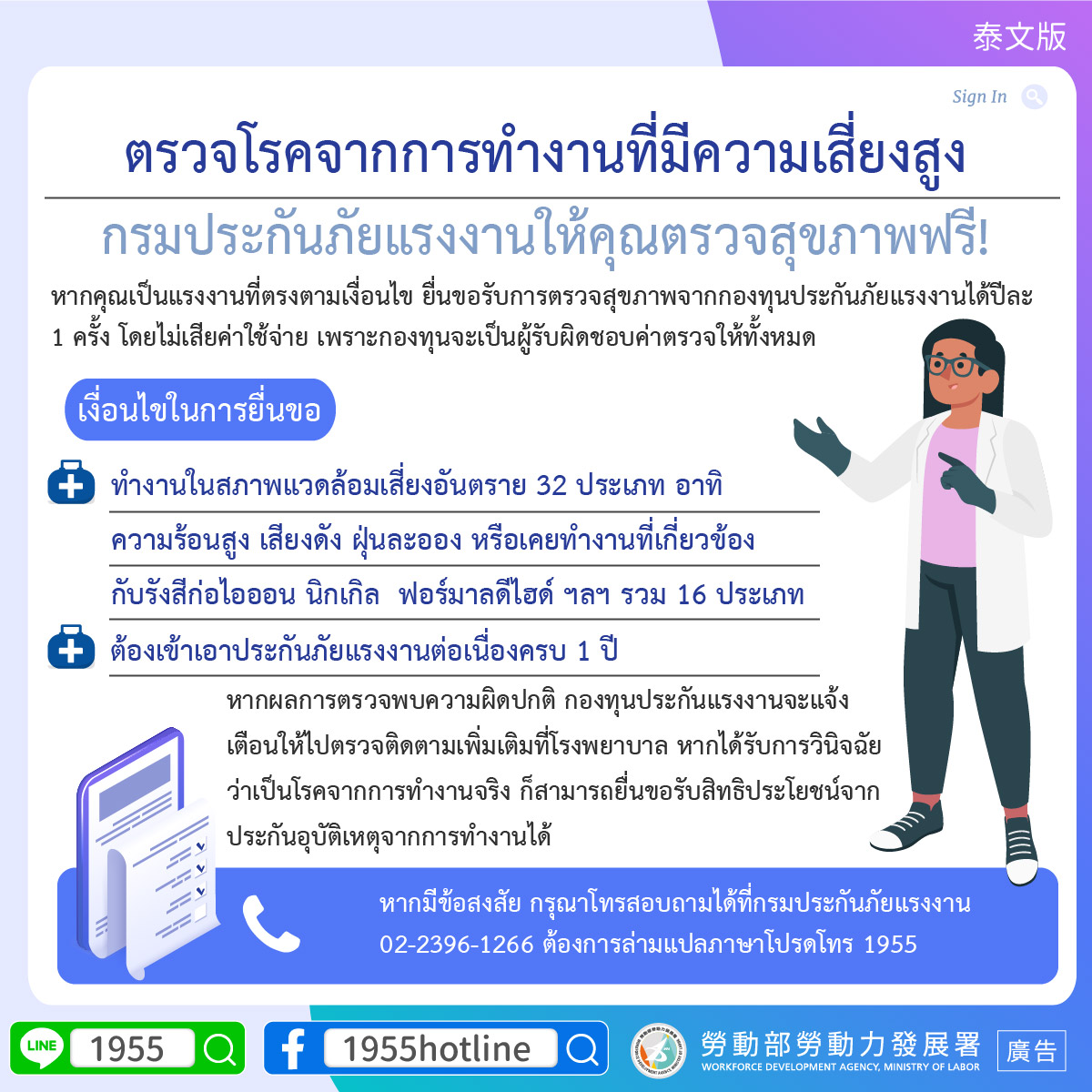▍ตรวจโรคจากการทำงานที่มีความเสี่ยงสูงกรมประกันภัยแรงงานให้คุณตรวจสุขภาพฟรี!