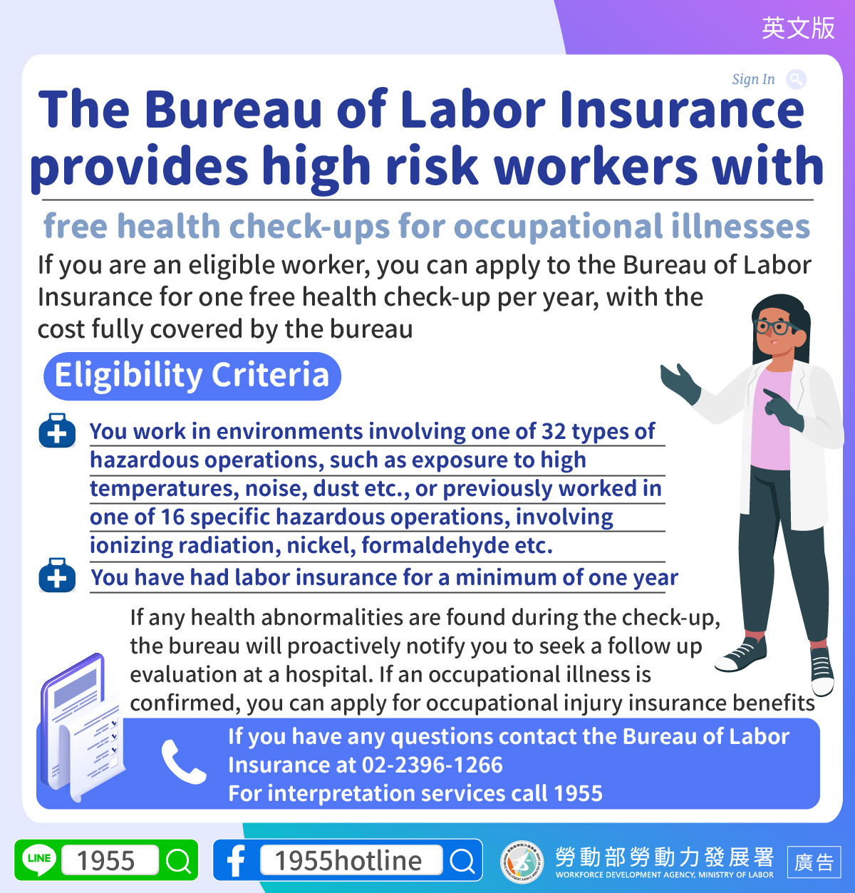 If you are an eligible worker, you can apply to the Bureau of Labor Insurance for one free health check-up per year, with the cost fully covered by the bureau
