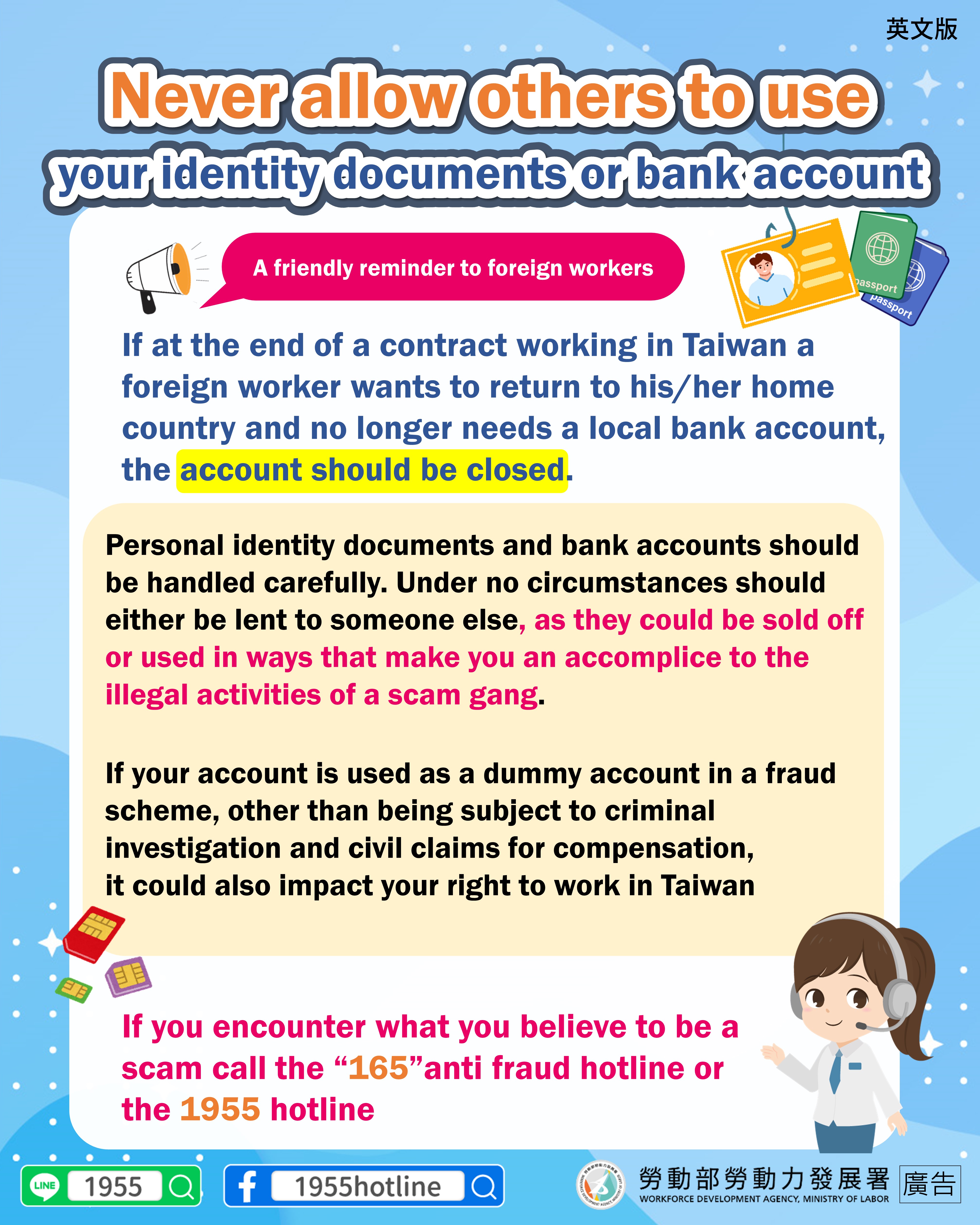 個人證件及帳戶請務必小心保管,切勿隨意借給他人使用,以免遭到有心人士變賣或利用,而成為詐騙集團的幫兇。
