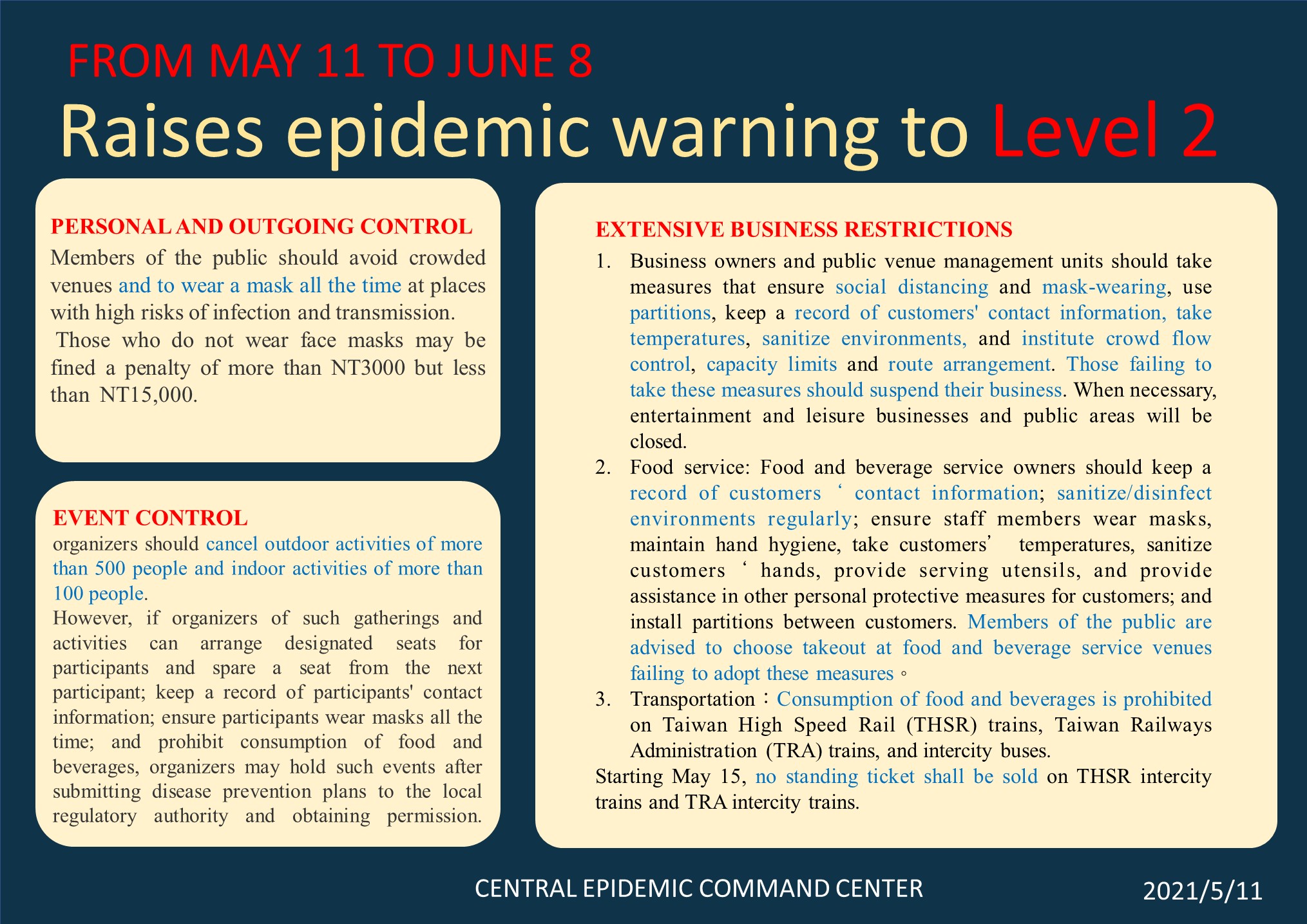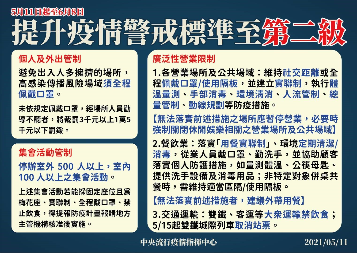 #中央流行疫情指揮中心 今(11)日表示,因應國內出現感染源不明之本土病例致社區感染風險增加,為防範發生持續社區傳播,自即日起至6月8日共4週,提升疫情警戒至第二級-「出現感染源不明之本土病例」,並對於個人及外出、集會活動、營業場域、大眾運輸實施相關限制措施如下: