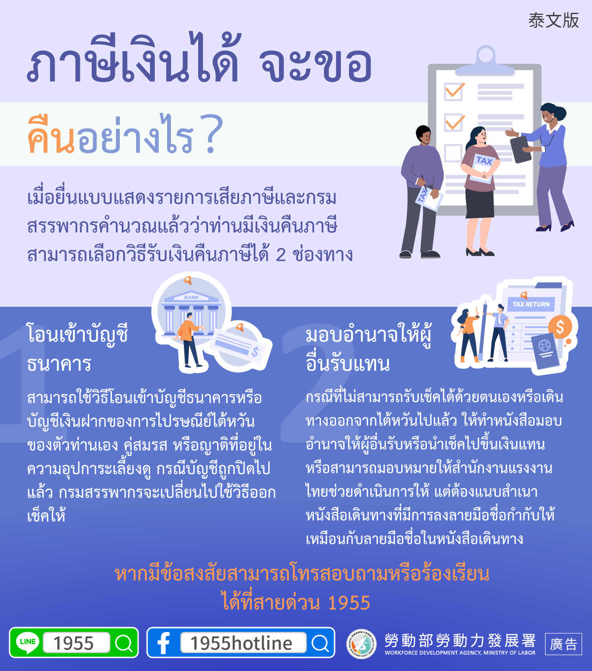 เมื่อยื่นแบบแสดงรายการเสียภาษีและกรมสรรพากรคำนวณแล้วว่าท่านมีเงินคืนภาษี สามารถเลือกวิธีรับเงินคืนภาษีได้ 2 ช่องทาง