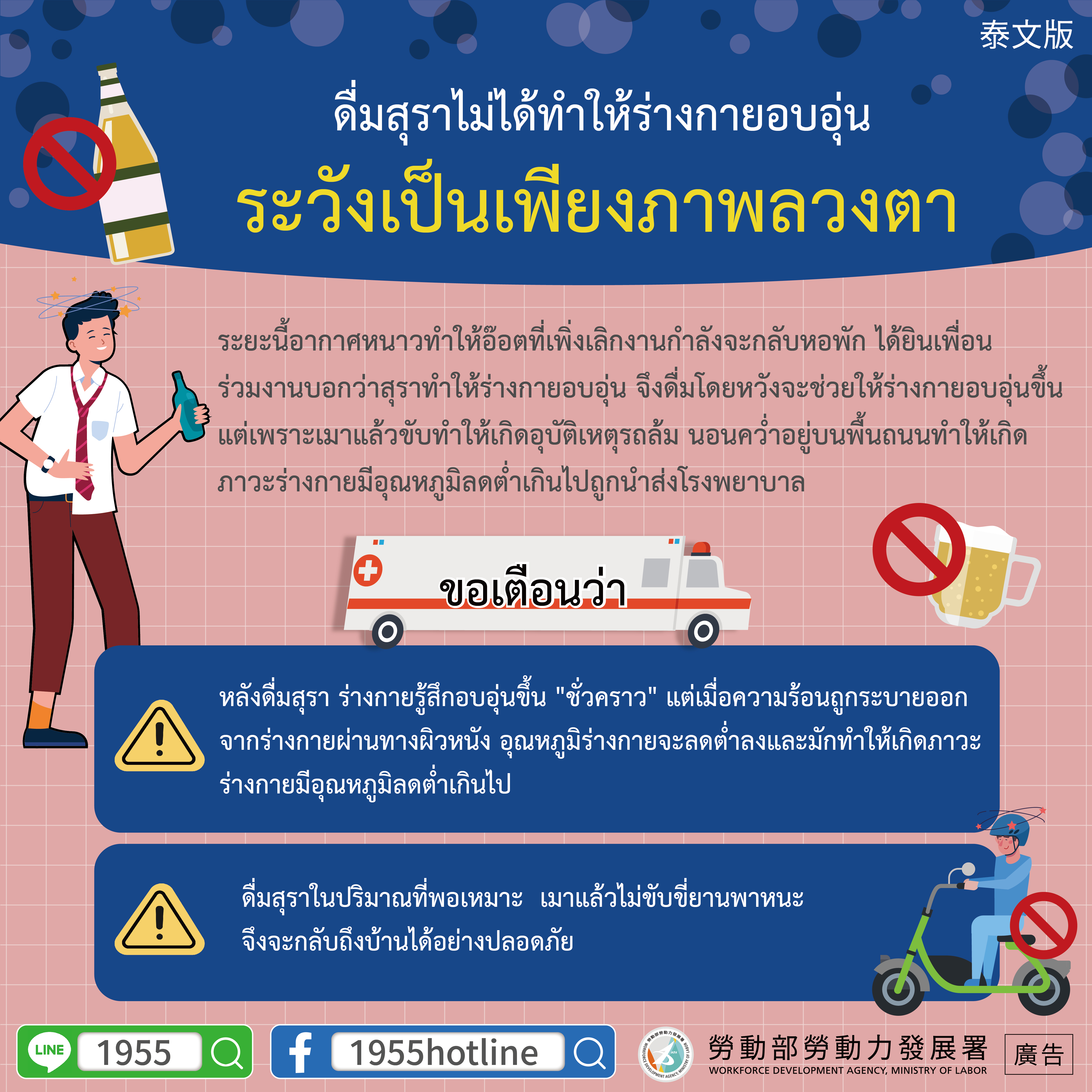 ระยะนี้อากาศหนาวทำให้อ๊อตที่เพิ่งเลิกงานกำลังจะกลับหอพัก ได้ยินเพื่อนร่วมงานบอกว่าสุราทำให้ร่างกายอบอุ่น จึงดื่มโดยหวังจะช่วยให้ร่างกายอบอุ่นขึ้น แต่เพราะเมาแล้วขับทำให้เกิดอุบัติเหตุรถล้ม นอนคว่ำอยู่บนพื้นถนนทำให้เกิดภาวะร่างกายมีอุณหภูมิลดต่ำเกินไปถูกนำส่งโรงพยาบาล
