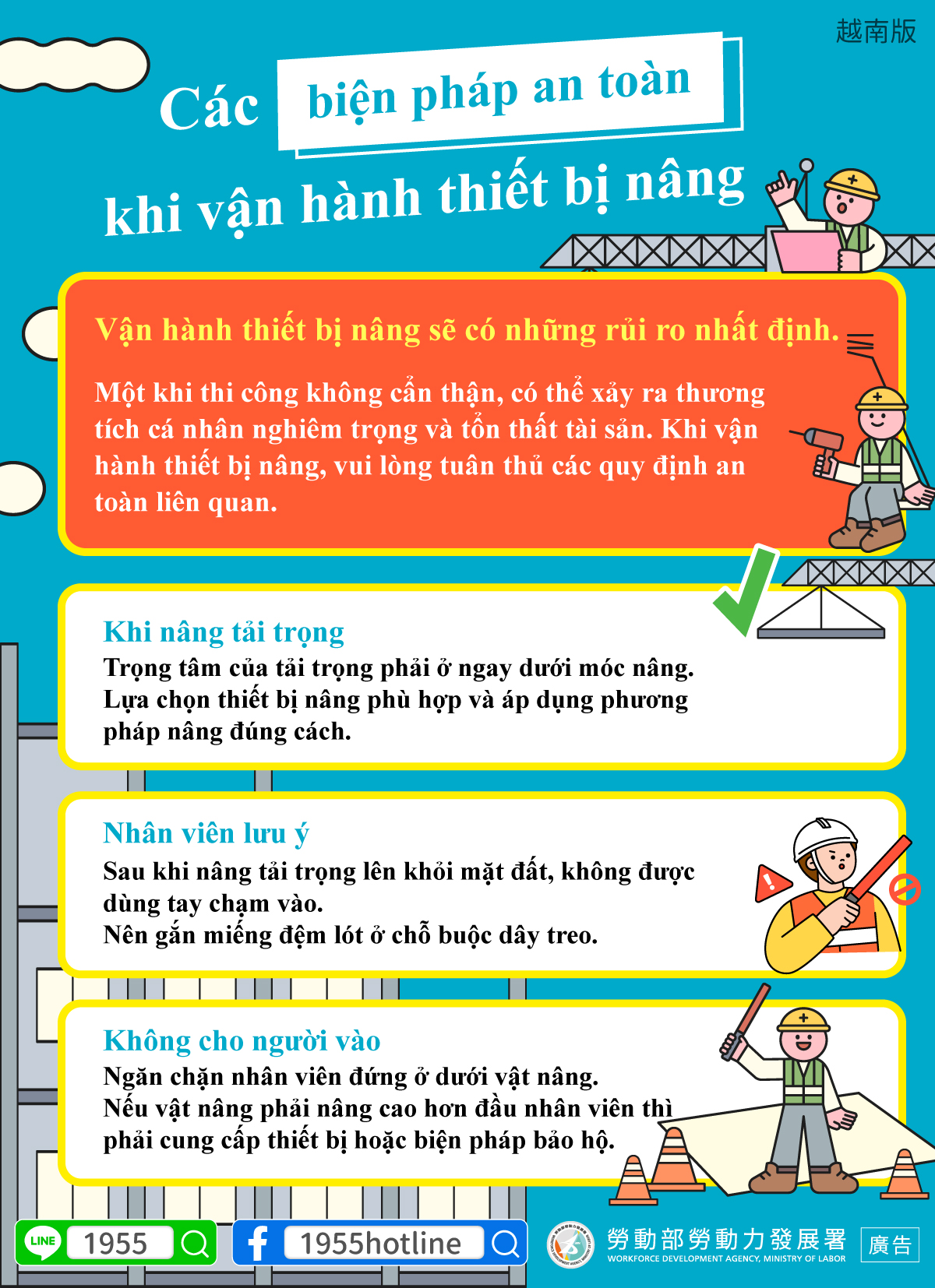 •Không cho người vào-Ngăn chặn nhân viên đứng ở dưới vật nâng.Nếu vật nâng phải nâng cao hơn đầu nhân viên thì phải cung cấp thiết bị hoặc biện pháp bảo hộ.
