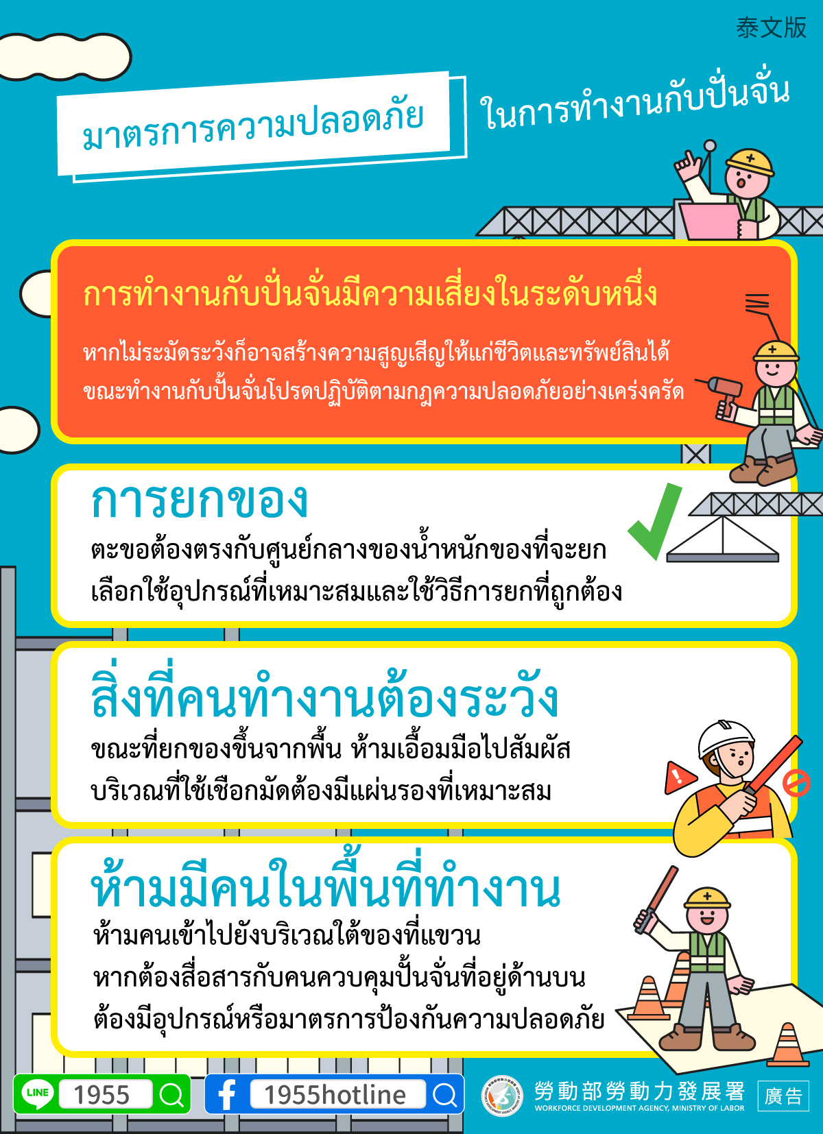 •ห้ามมีคนในพื้นที่ทำงาน-ห้ามคนเข้าไปยังบริเวณใต้ของที่แขวนหากต้องสื่อสารกับคนควบคุมปั้นจั่นที่อยู่ด้านบน ต้องมีอุปกรณ์หรือมาตรการป้องกันความปลอดภัย