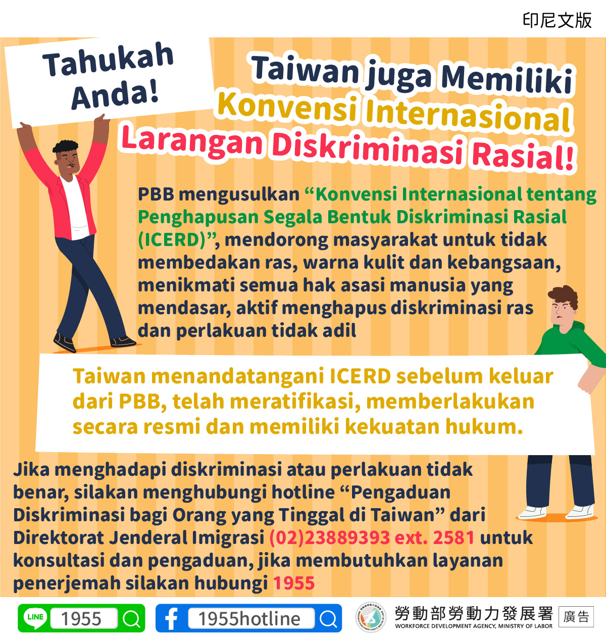 Jika menghadapi diskriminasi atau perlakuan tidak benar, silakan menghubungi hotline “Pengaduan Diskriminasi bagi Orang yang Tinggal di Taiwan” dari Direktorat Jenderal Imigrasi (02)23889393 ext. 2581 untuk konsultasi dan pengaduan, jika membutuhkan layanan penerjemah silakan hubungi 1955