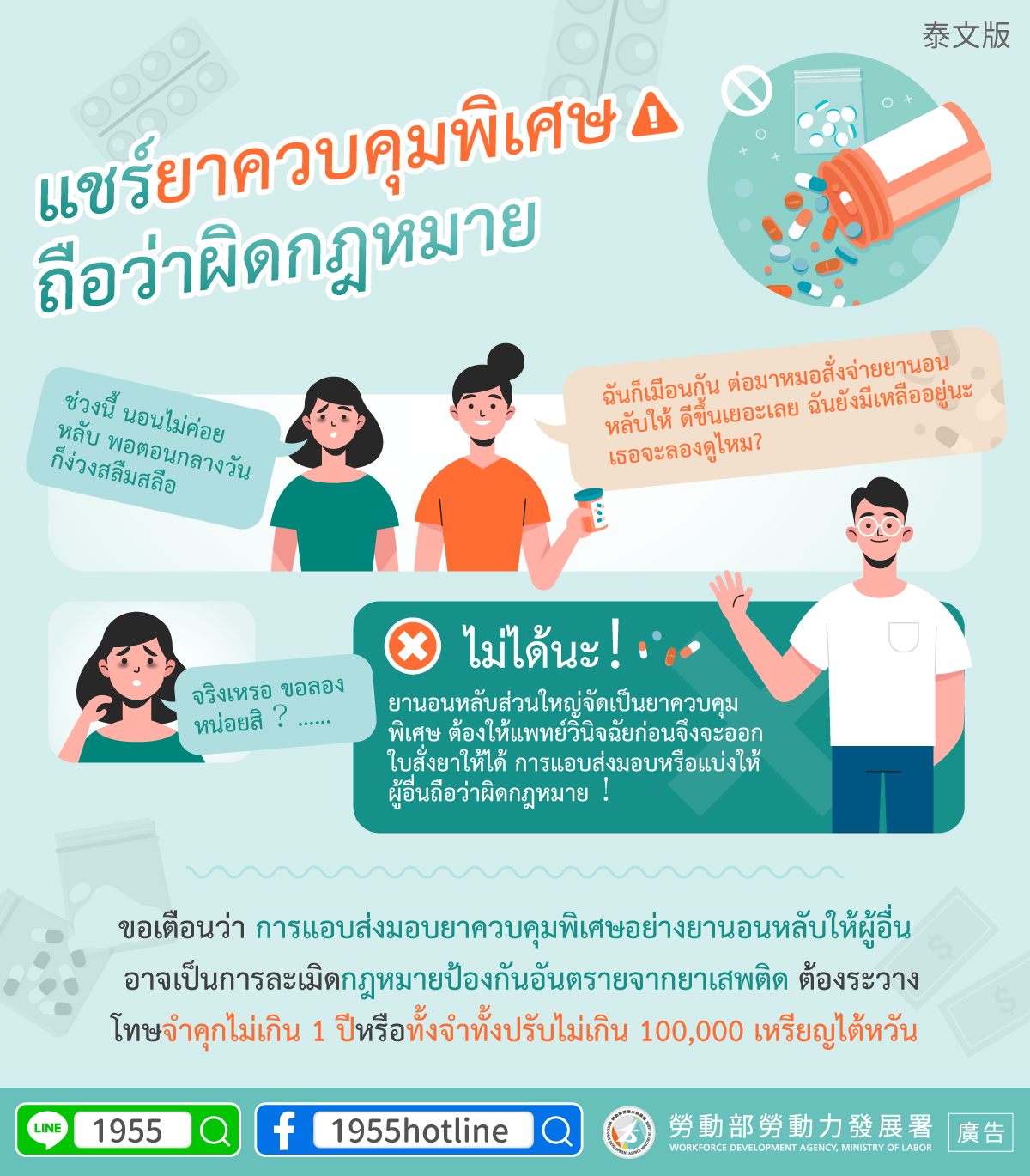 C:ไม่ได้นะ!ยานอนหลับส่วนใหญ่จัดเป็นยาควบคุมพิเศษ ต้องให้แพทย์วินิจฉัยก่อนจึงจะออกใบสั่งยาให้ได้ การแอบส่งมอบหรือแบ่งให้ผู้อื่นถือว่าผิดกฎหมาย!