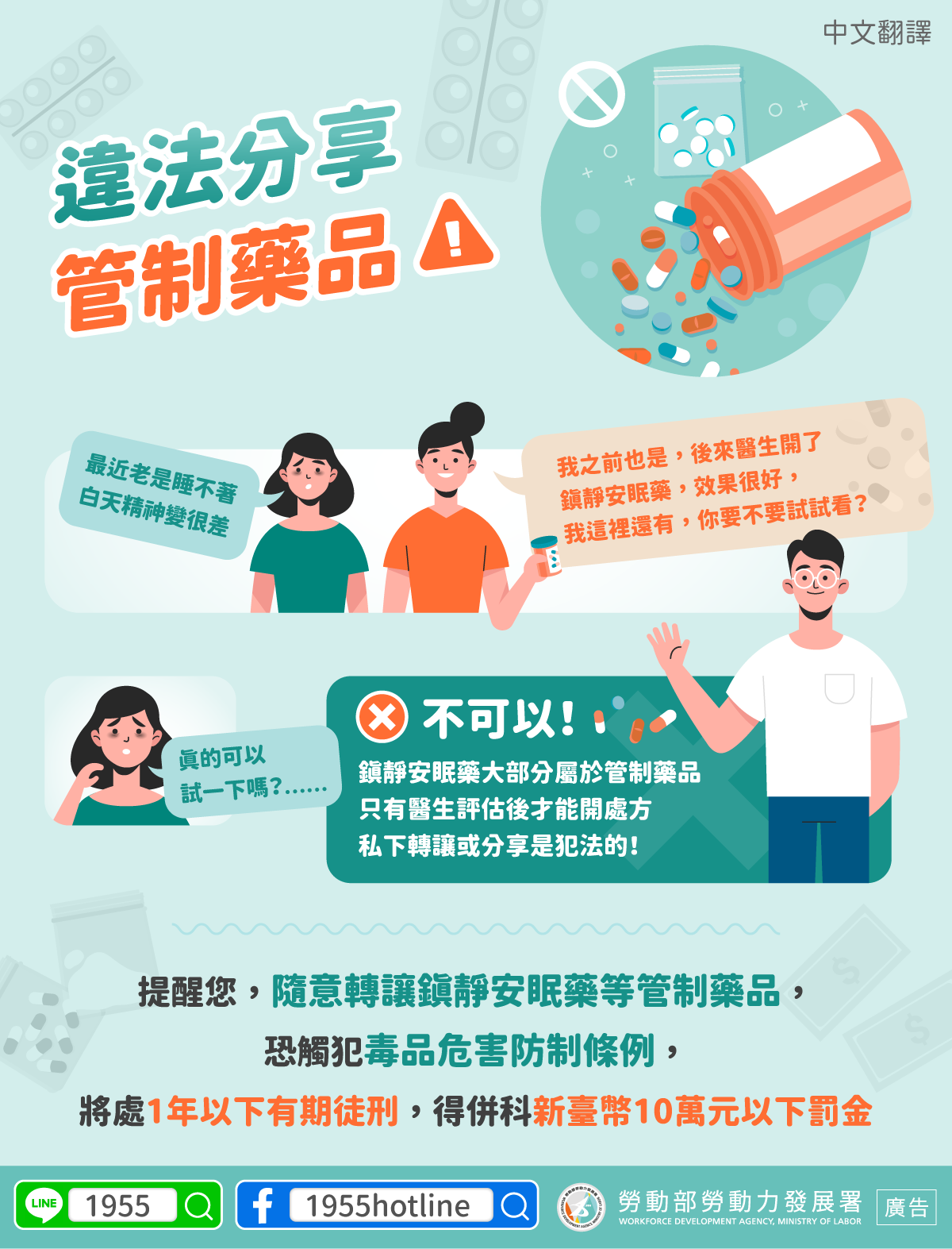 提醒您,隨意轉讓鎮靜安眠藥等管制藥品,恐觸犯毒品危害防制條例,將處1年以下有期徒刑,得併科新臺幣10萬元以下罰金