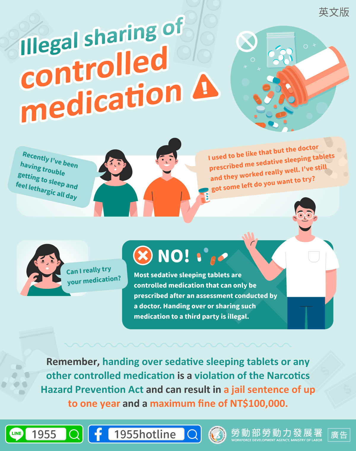 Remember, handing over sedative sleeping tablets or any other controlled medication is a violation of the Narcotics Hazard Prevention Act and can result in a jail sentence of up to one year and a maximum fine of NT$100,000.