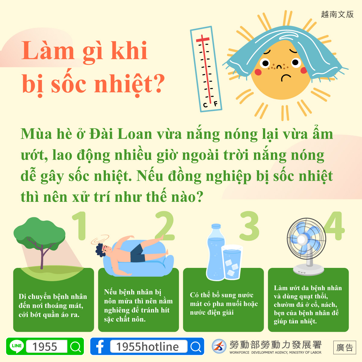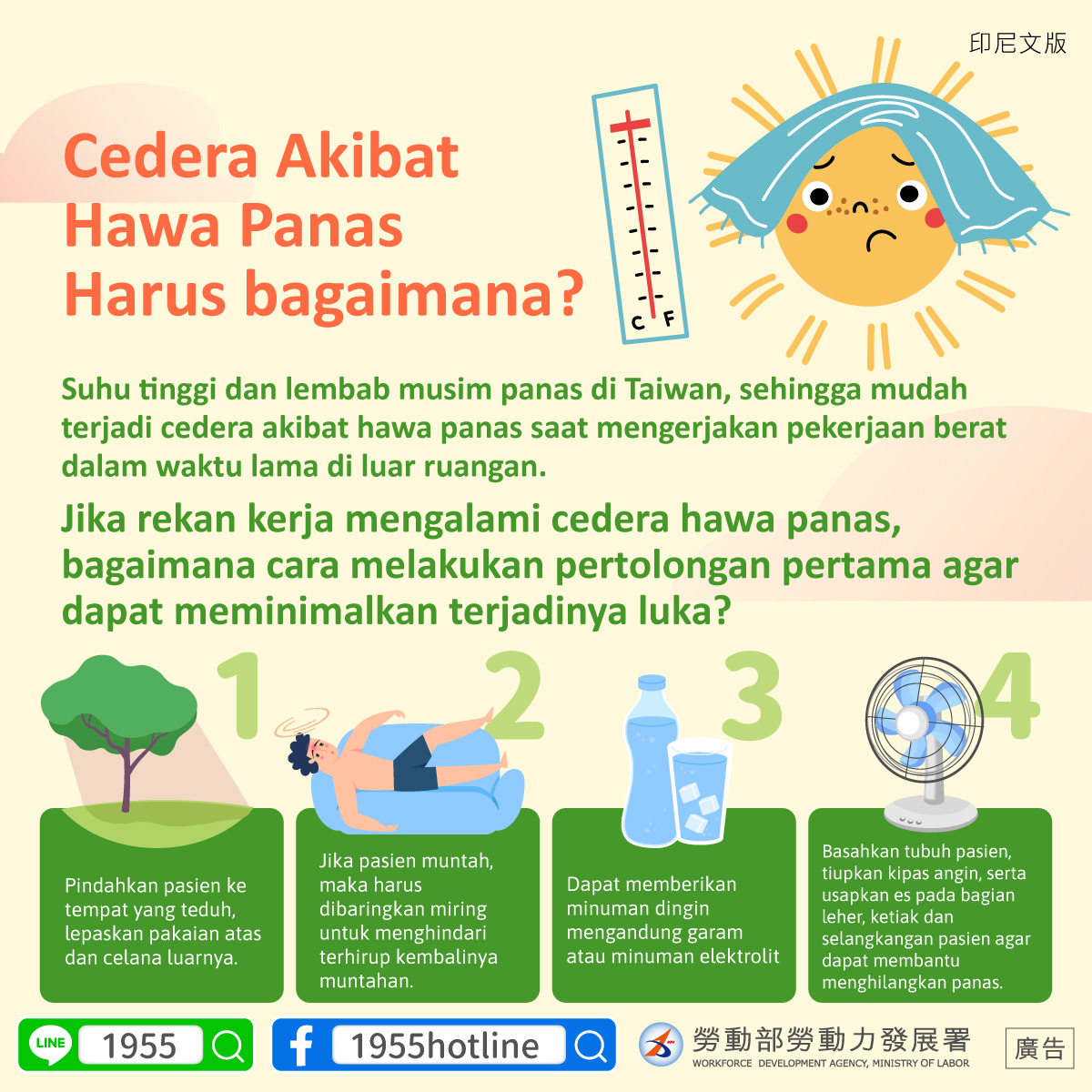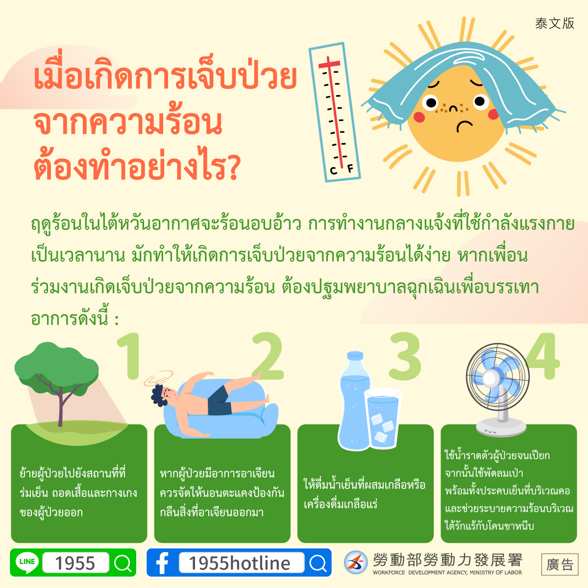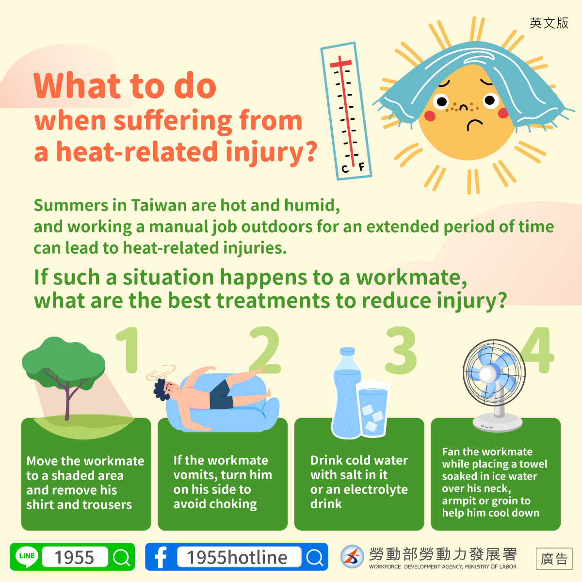 ฤดูร้อนในไต้หวันอากาศจะร้อนอบอ้าว การทำงานกลางแจ้งที่ใช้กำลังแรงกายเป็นเวลานาน มักทำให้เกิดการเจ็บป่วยจากความร้อนได้ง่าย หากเพื่อน