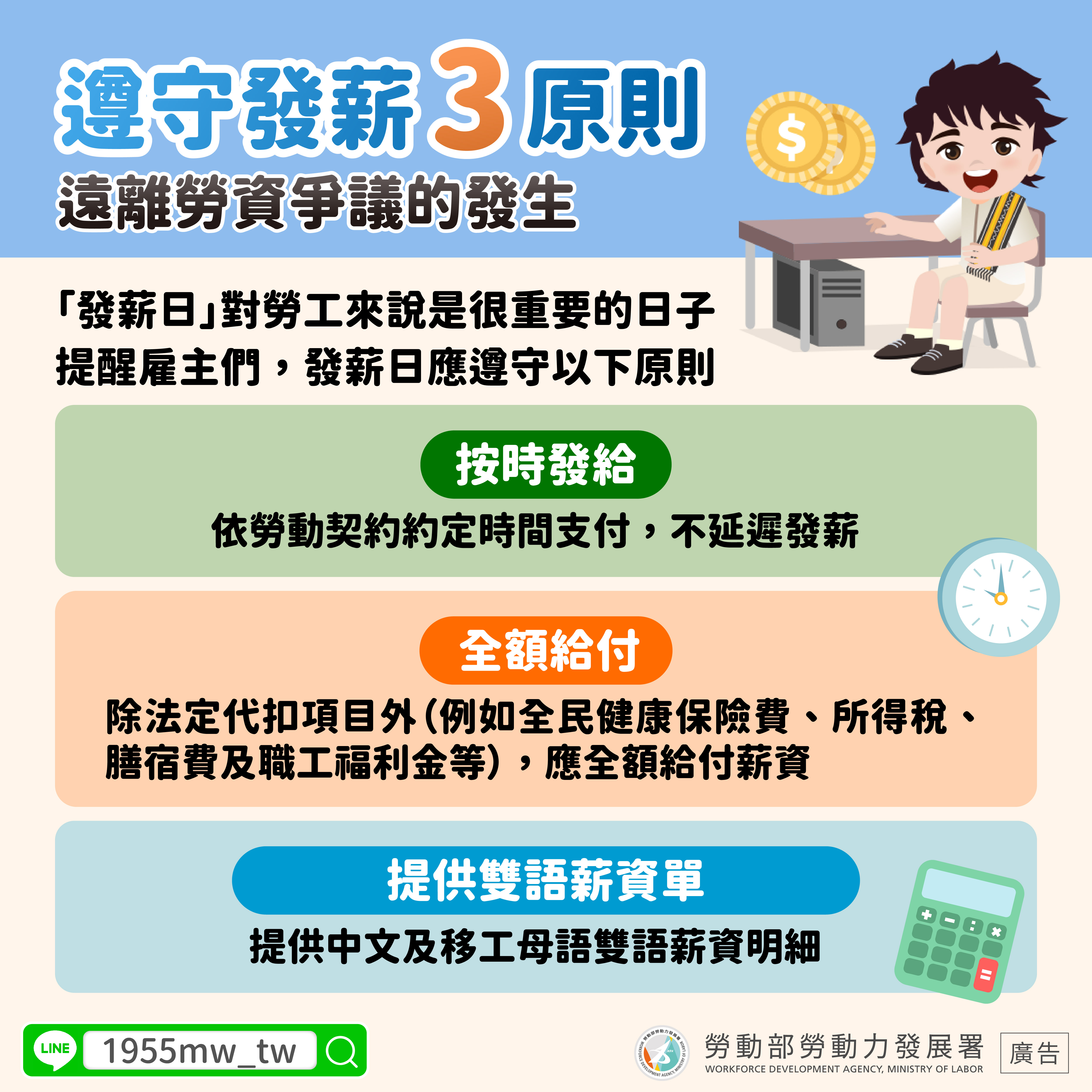 •按時發給-依勞動契約約定時間支付,不延遲發薪