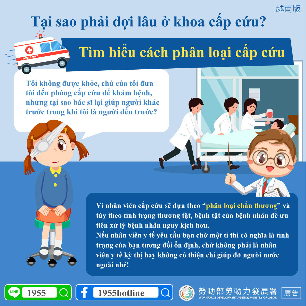 Vì nhân viên cấp cứu sẽ dựa theo “phân loại chấn thương” và tùy theo tình trạng thương tật, bệnh tật của bệnh nhân để ưu tiên xử lý bệnh nhân nguy kịch hơn. Nếu nhân viên y tế yêu cầu bạn chờ một tí thì có nghĩa là tình trạng của bạn tương đối ổn định, chứ không phải là nhân viên y tế kỳ thị hay không có thiện chí giúp đỡ người nước ngoài nhé!