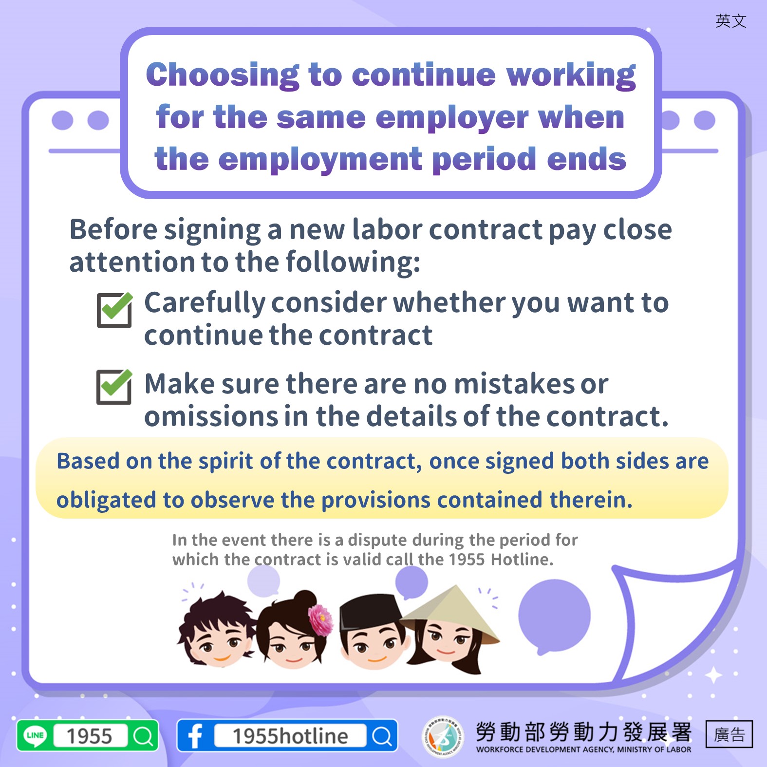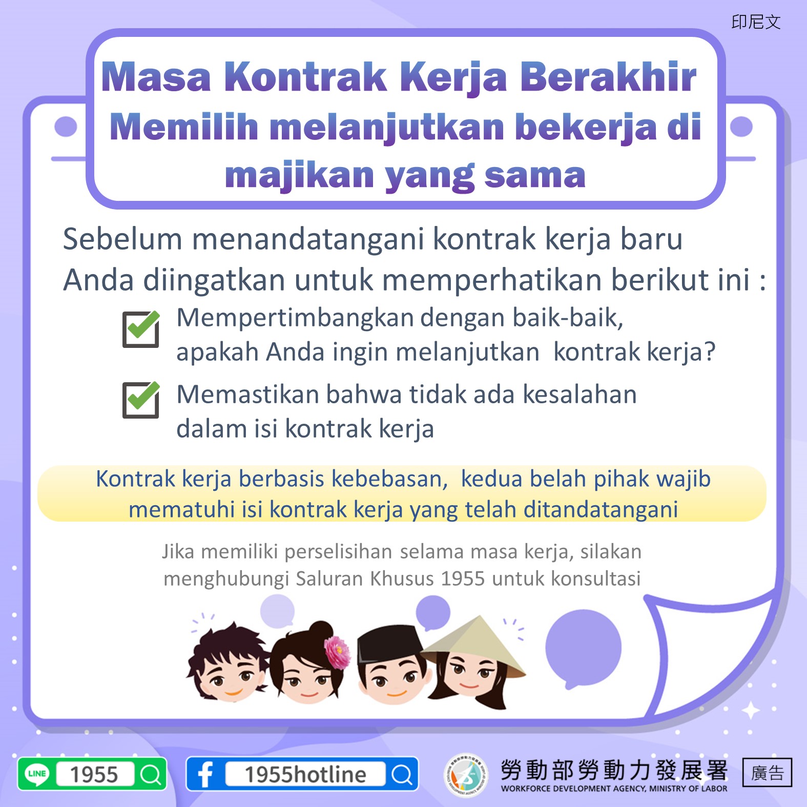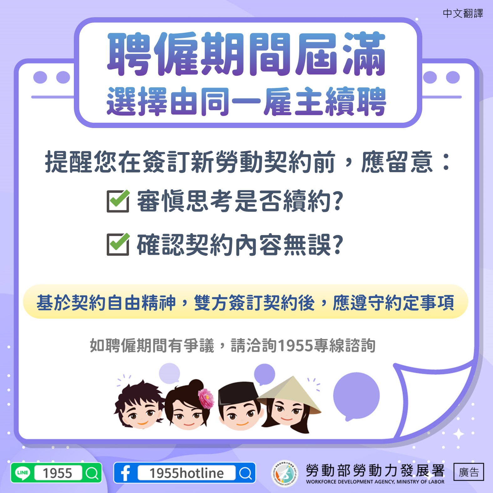 契約自由精神-聘僱期間屆滿選擇由同一雇主續聘應遵守約定事項-多國語言版