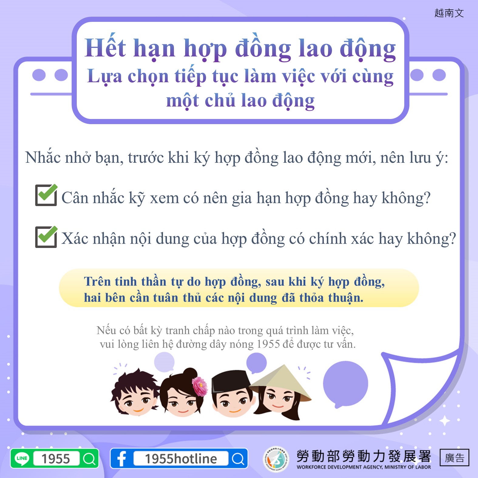 Jika memiliki perselisihan selama masa kerja, silakan menghubungi Saluran Khusus 1955 untuk konsultasi