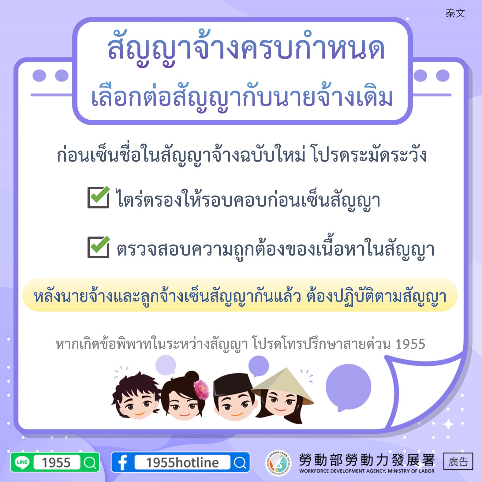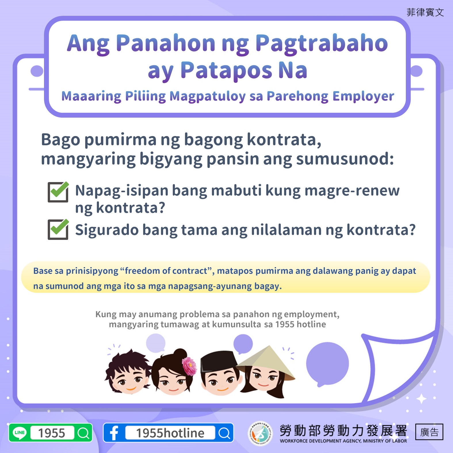 Kung may anumang problema sa panahon ng employment, mangyaring tumawag at kumunsulta sa 1955 hotline