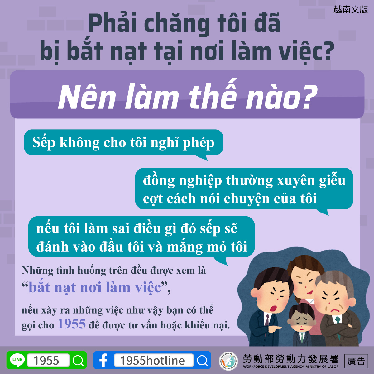 Phải chăng tôi đã bị bắt nạt tại nơi làm việc? Nên làm thế nào? “Sếp không cho tôi nghỉ phép”, “đồng nghiệp thường xuyên giễu cợt cách nói chuyện của tôi”, “nếu tôi làm sai điều gì đó sếp sẽ đánh vào đầu tôi và mắng mỏ tôi”. Những tình huống trên đều được xem là “bắt nạt nơi làm việc”, nếu xảy ra những việc như vậy bạn có thể gọi cho 1955 để được tư vấn hoặc khiếu nại.
