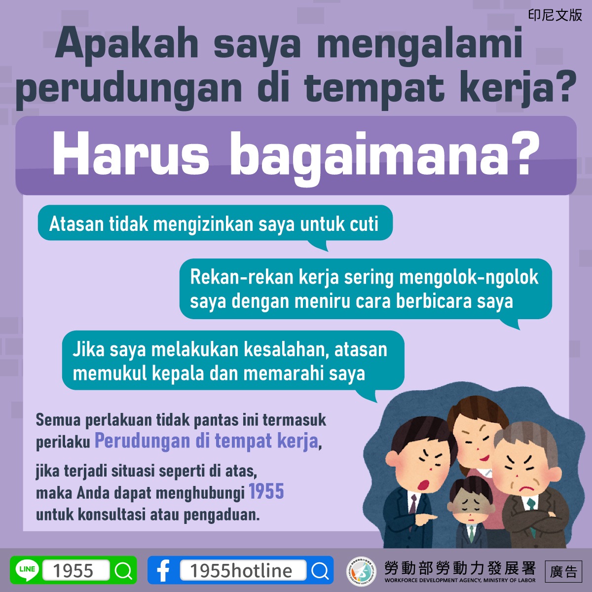 Apakah saya mengalami perudungan di tempat kerja? Harus bagaimana? 「Atasan tidak mengizinkan saya untuk cuti」、「Rekan-rekan kerja sering mengolok-ngolok saya dengan meniru cara berbicara saya」、「Jika saya melakukan kesalahan, atasan memukul kepala dan memarahi saya」 Semua perlakuan tidak pantas ini termasuk perilaku 「Perudungan di tempat kerja」, jika terjadi situasi seperti di atas, maka Anda dapat menghubungi 1955 untuk konsultasi atau pengaduan.