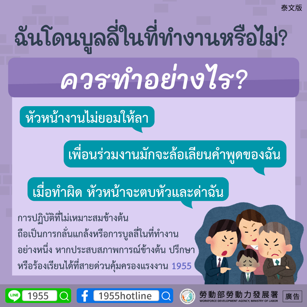 ฉันโดนบูลลี่ในที่ทำงานหรือไม่? ควรทำอย่างไร? “หัวหน้างานไม่ยอมให้ลา” “เพื่อนร่วมงานมักจะล้อเลียนคำพูดของฉัน” “เมื่อทำผิด หัวหน้าจะตบหัวและด่าฉัน” การปฏิบัติที่ไม่เหมาะสมข้างต้น ถือเป็นการกลั่นแกล้งหรือการบูลลี่ในที่ทำงานอย่างหนึ่ง หากประสบสภาพการณ์ข้างต้น ปรึกษาหรือร้องเรียนได้ที่สายด่วนคุ้มครองแรงงาน 1955