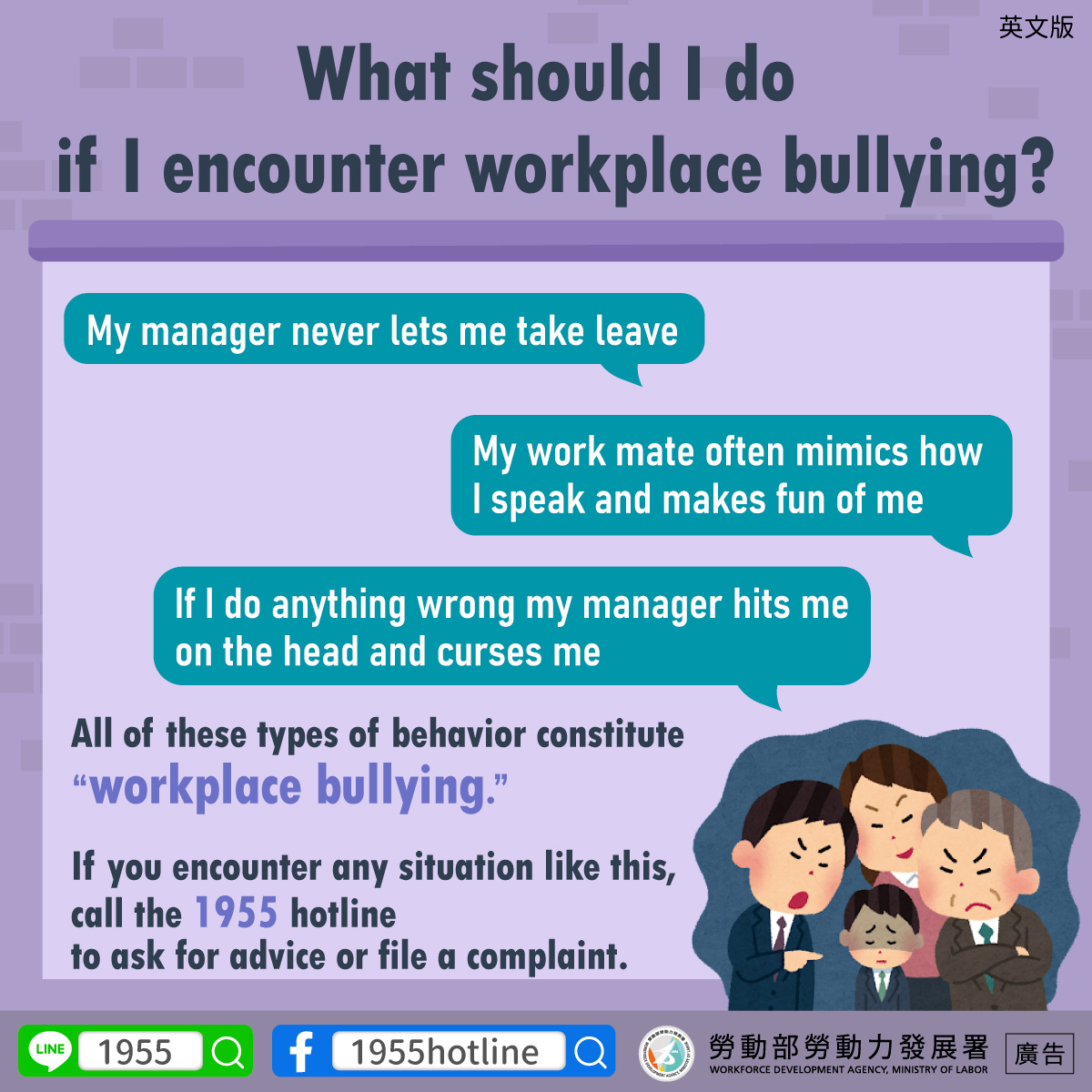 ▍我遇到職場霸凌了嗎? 該怎麼辦呢? 「主管都不讓我請假」、「同事常常學我講話取笑我」、「做錯事情主管會打我的頭罵我」 這些不當的對待都算是一種「職場霸凌」,如有發生以上狀況,可以撥打1955進行諮詢或申訴喔 。