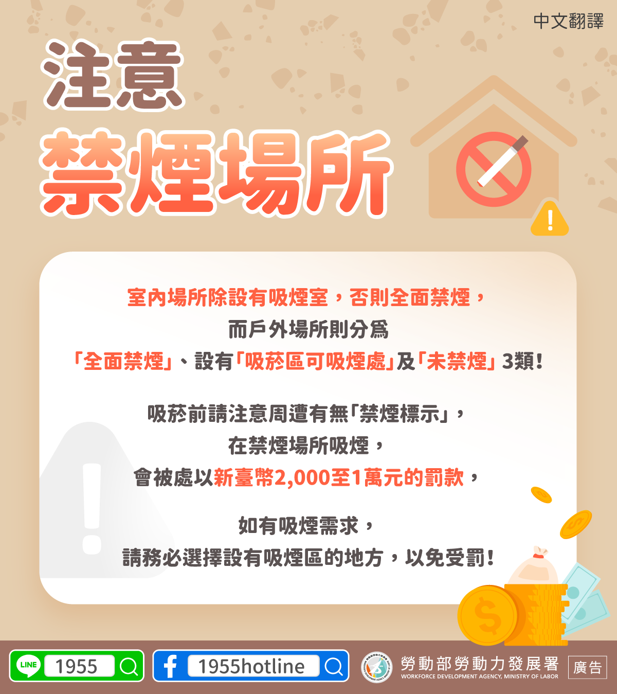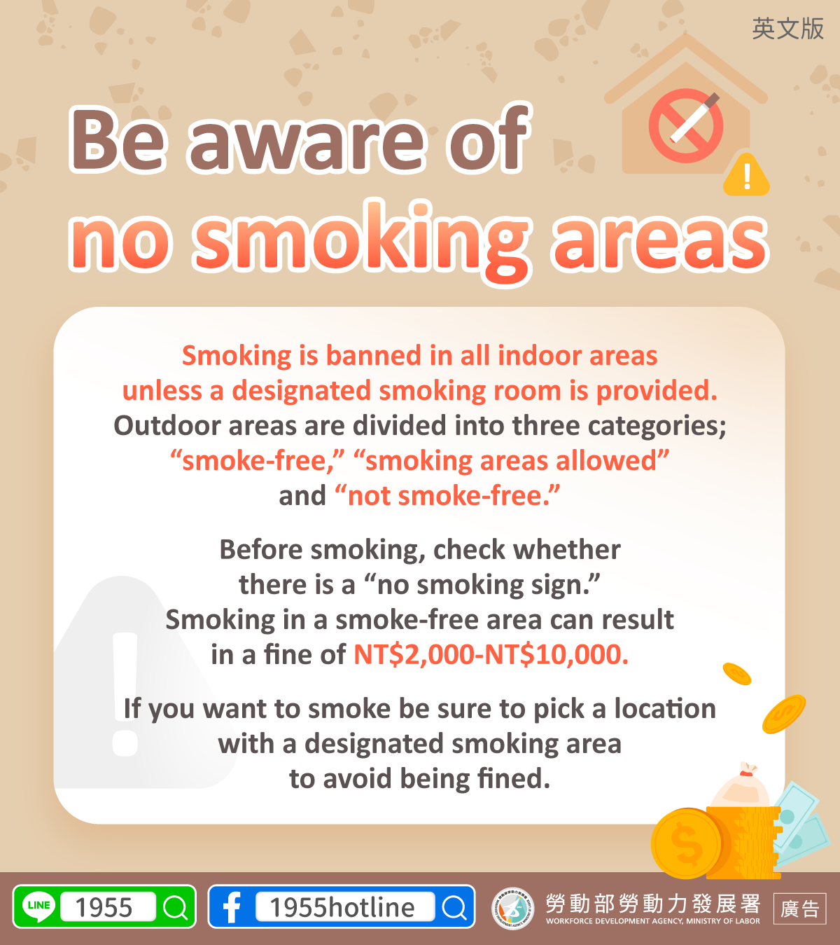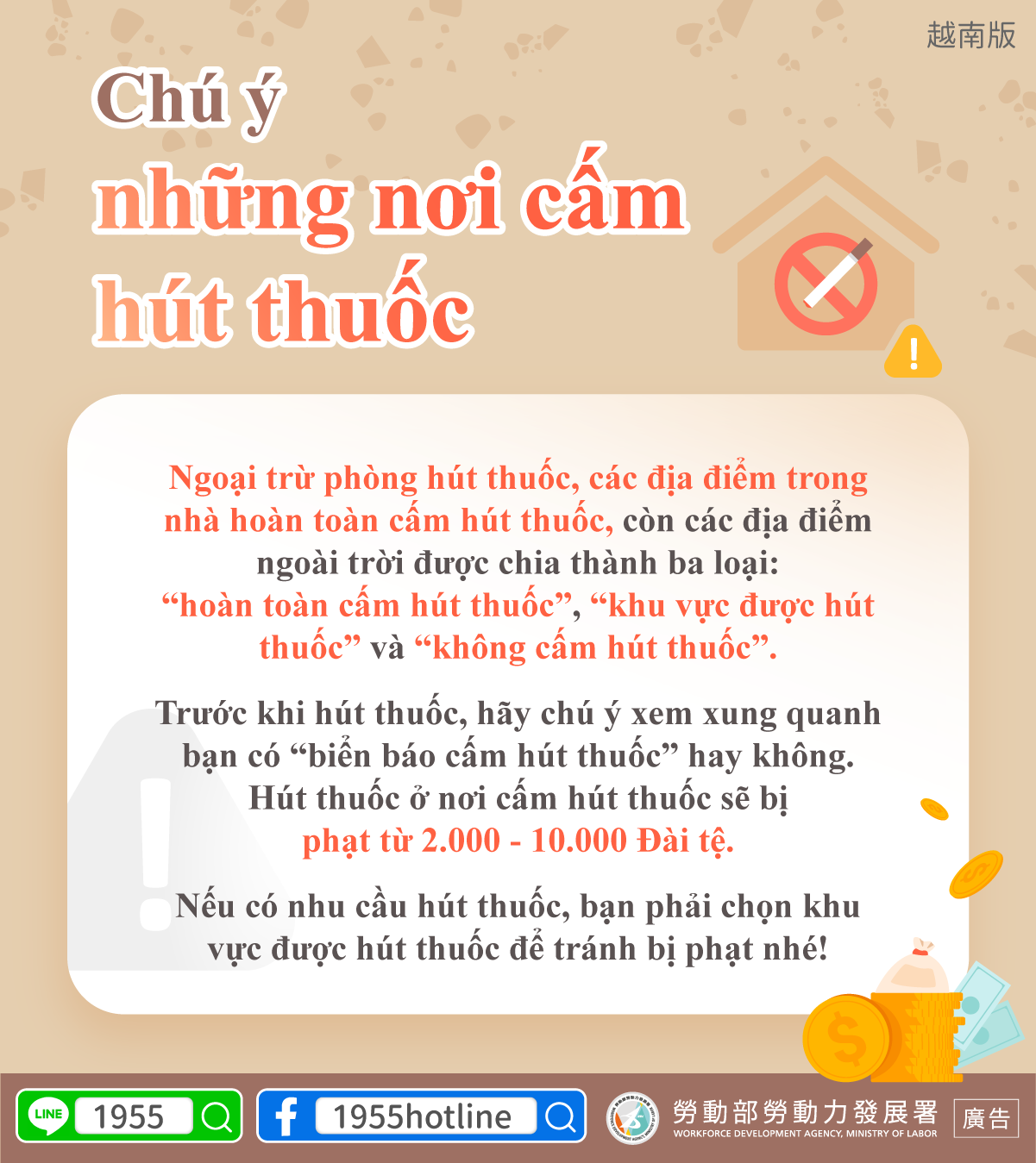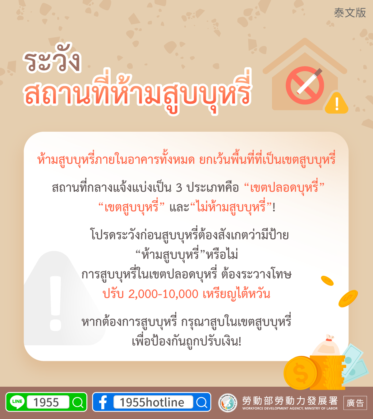 หากต้องการสูบบุหรี่ กรุณาสูบในเขตสูบบุหรี่เพื่อป้องกันถูกปรับเงิน!
