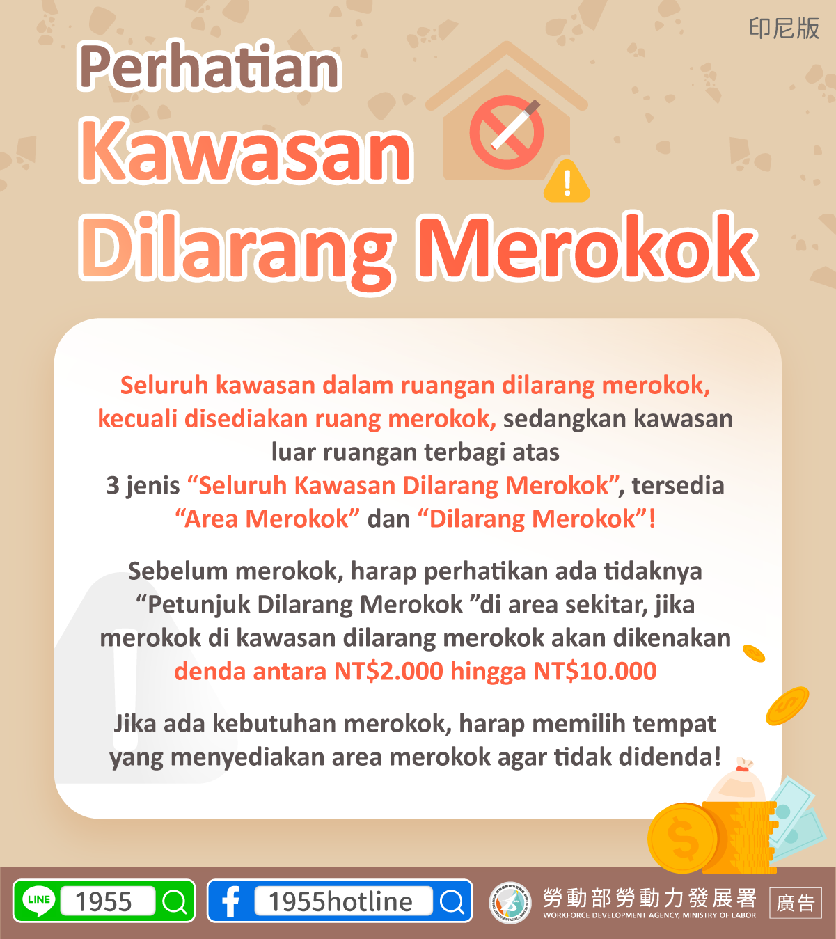 Sebelum merokok, harap perhatikan ada tidaknya“Petunjuk Dilarang Merokok”di area sekitar, jika merokok di kawasan dilarang merokok akan dikenakan denda antara NT$2.000 hingga NT$10.000