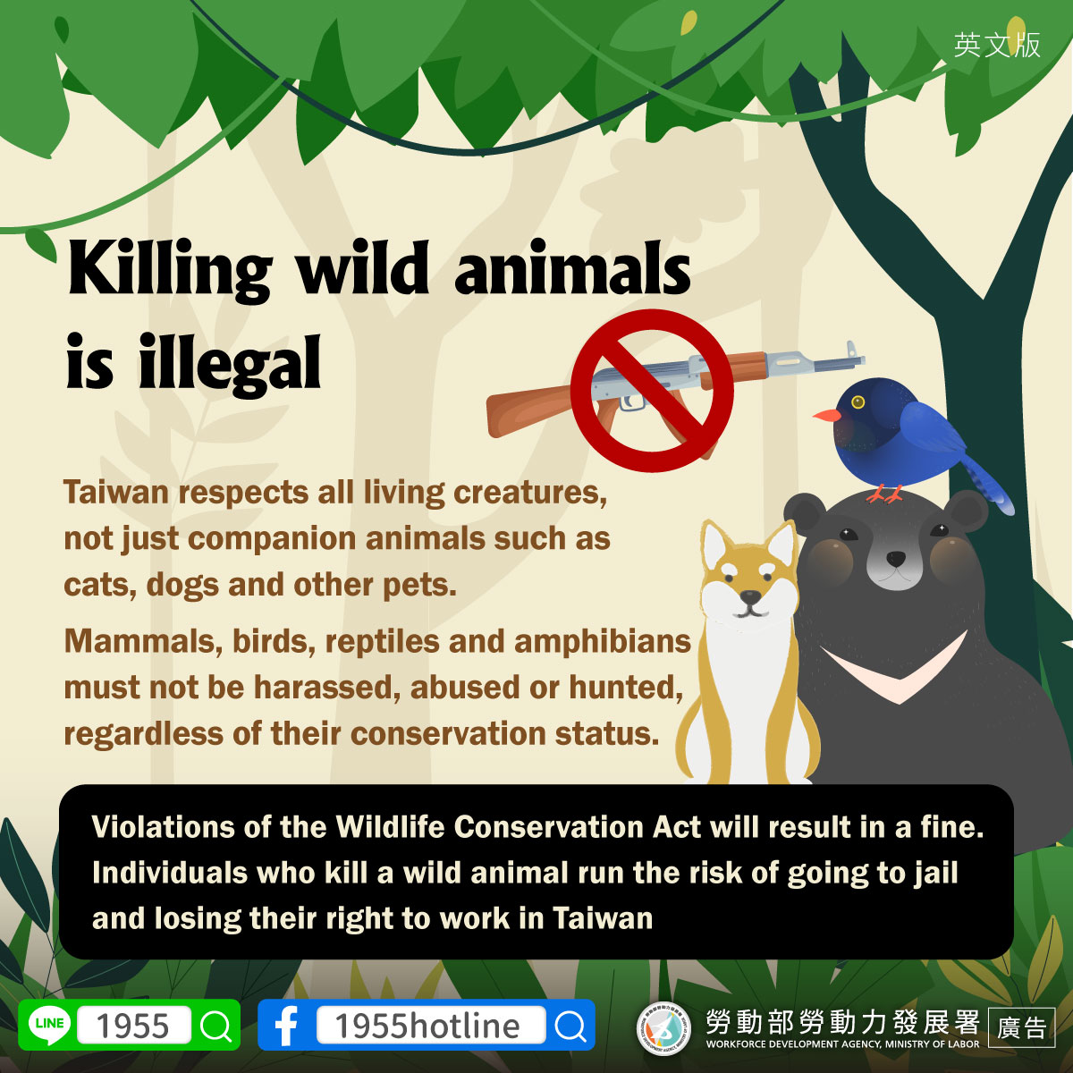Violations of the Wildlife Conservation Act will result in a fine. Individuals who kill a wild animal run the risk of going to jail and losing their right to work in Taiwan.