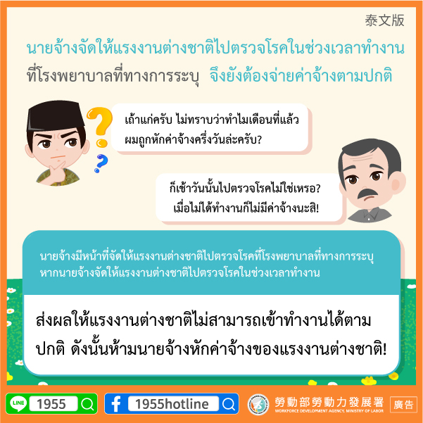 นายจ้างมีหน้าที่จัดให้แรงงานต่างชาติไปตรวจโรคที่โรงพยาบาลที่ทางการระบุ หากนายจ้างจัดให้แรงงานต่างชาติไปตรวจโรคในช่วงเวลาทำงาน