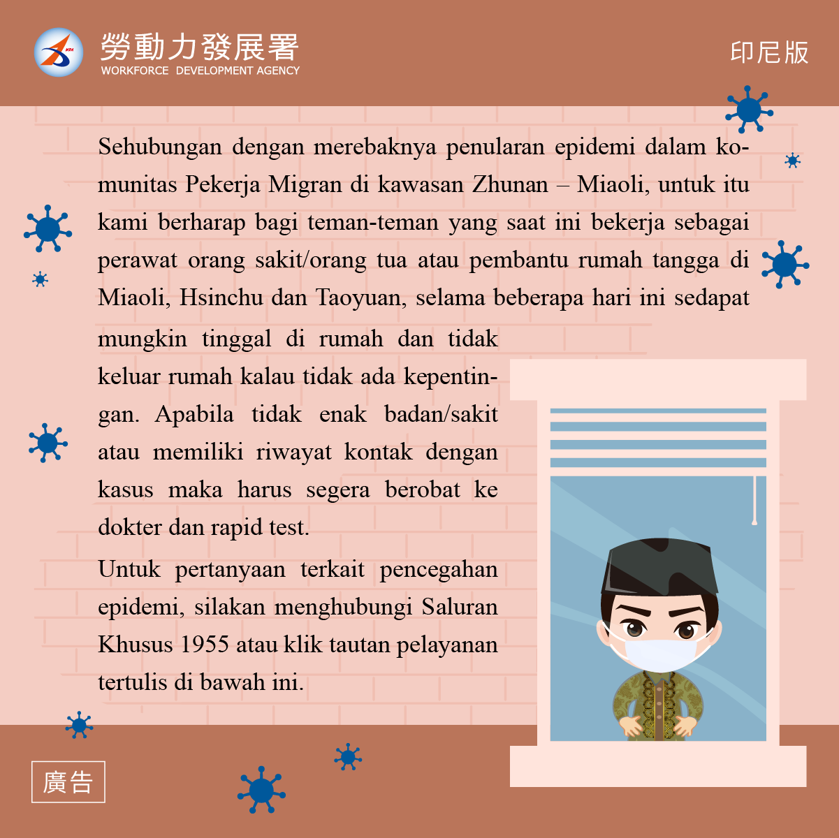 移工朋友!因近來苗栗竹南地區有發生移工群聚染疫情形,如果您目前是在苗栗、新竹、桃園從事家庭看護或幫傭工作,請您這幾天非必要不要外出,儘量留在家中,如果身體不適或有接觸史請儘速就醫、快篩。防疫問題可電洽1955或點外語版首頁文字客服