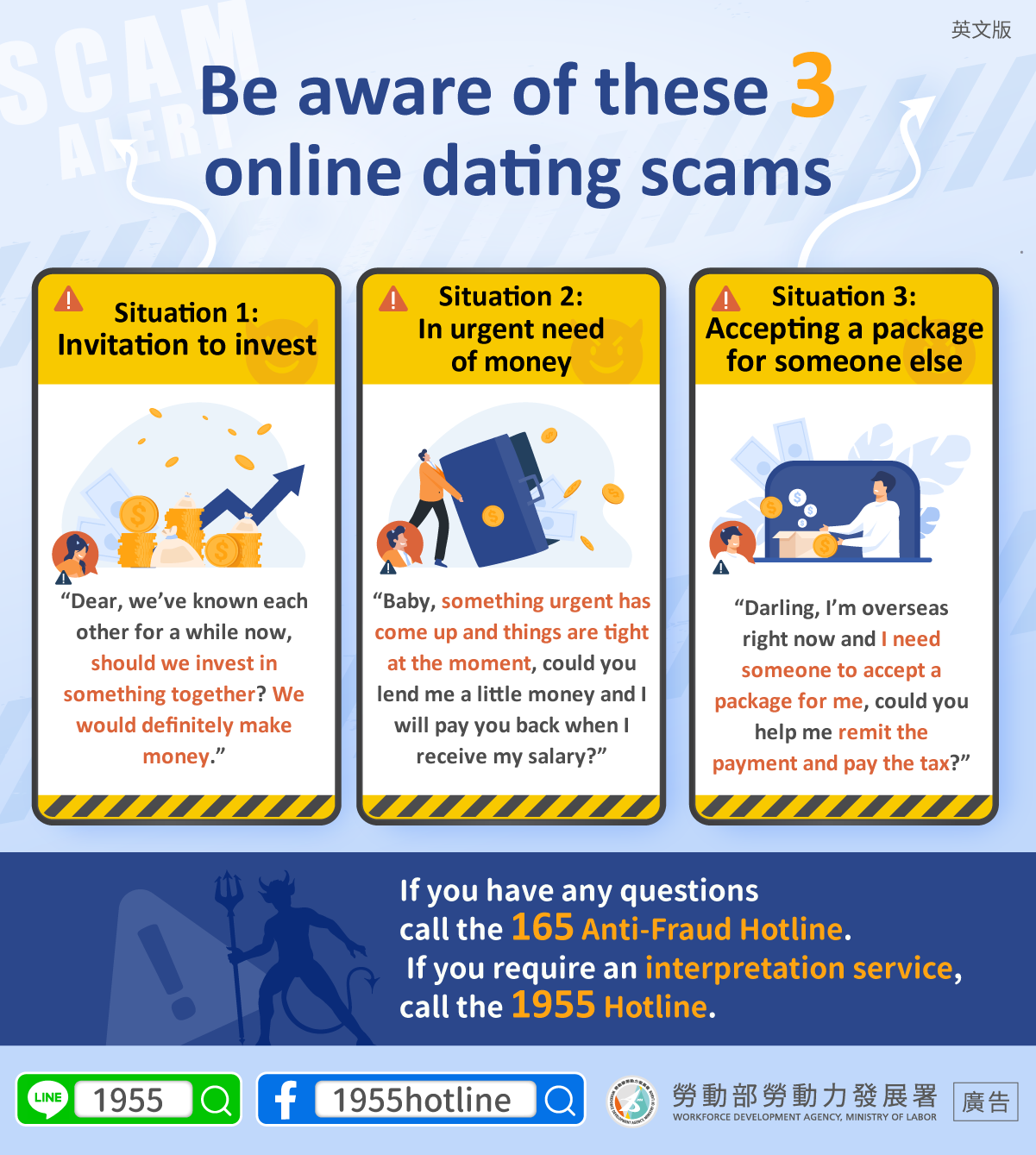 如有疑問,請撥打 165 防詐騙專線。如需通譯服務,可撥 1955 打尋求協助!
