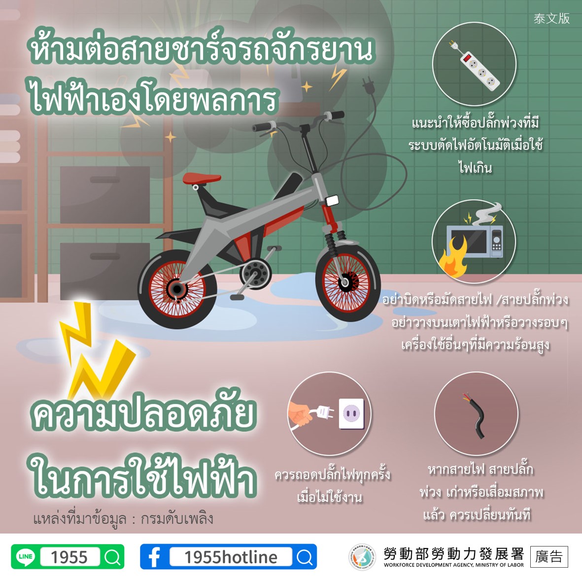 【ความปลอดภัยในการใช้ไฟฟ้า】 :ห้ามต่อสายชาร์จรถจักรยานไฟฟ้าเองโดยพลการ
