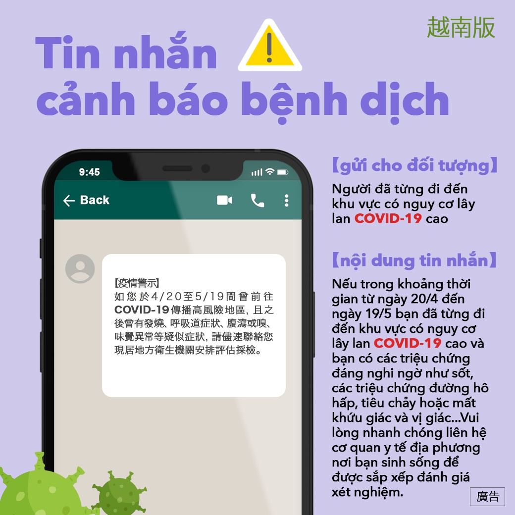 疫情警示簡訊【發送對象】曾前往COVID-19傳播高風險地區者【簡訊內容】如您於4/20至5/19間曾前往COVID-19傳播高風險地區,且之後曾有發燒、呼吸道症狀、腹瀉或嗅、味覺異常等疑似症狀,請儘速聯絡您現居地方衛生機關安排評估採檢。