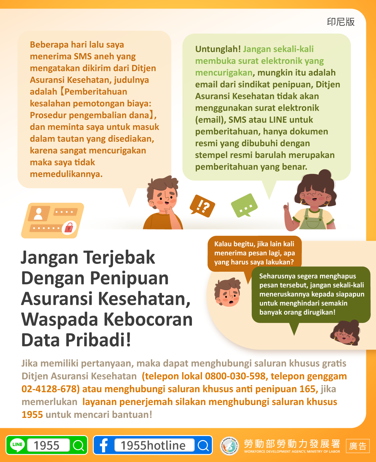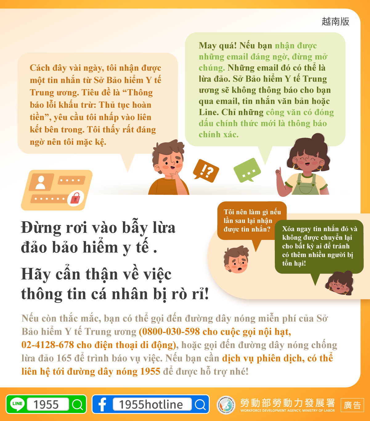 有相關疑問可撥打健保署免付費專線(市話0800-030-598,手機02-4128-678),或撥165反詐騙專線報案,如需通譯服務可洽1955專線尋求協助!
