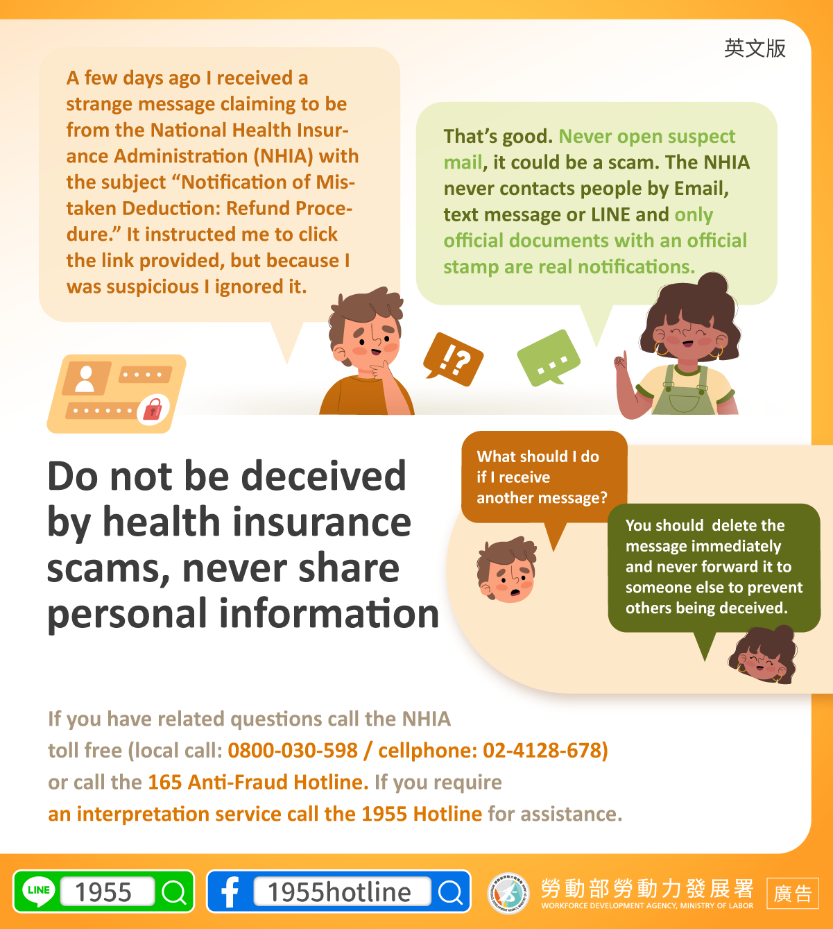 B:That’s good. Never open suspect mail, it could be a scam. The NHIA never contacts people by Email, text message or LINE and only official documents with an official stamp are real notifications.