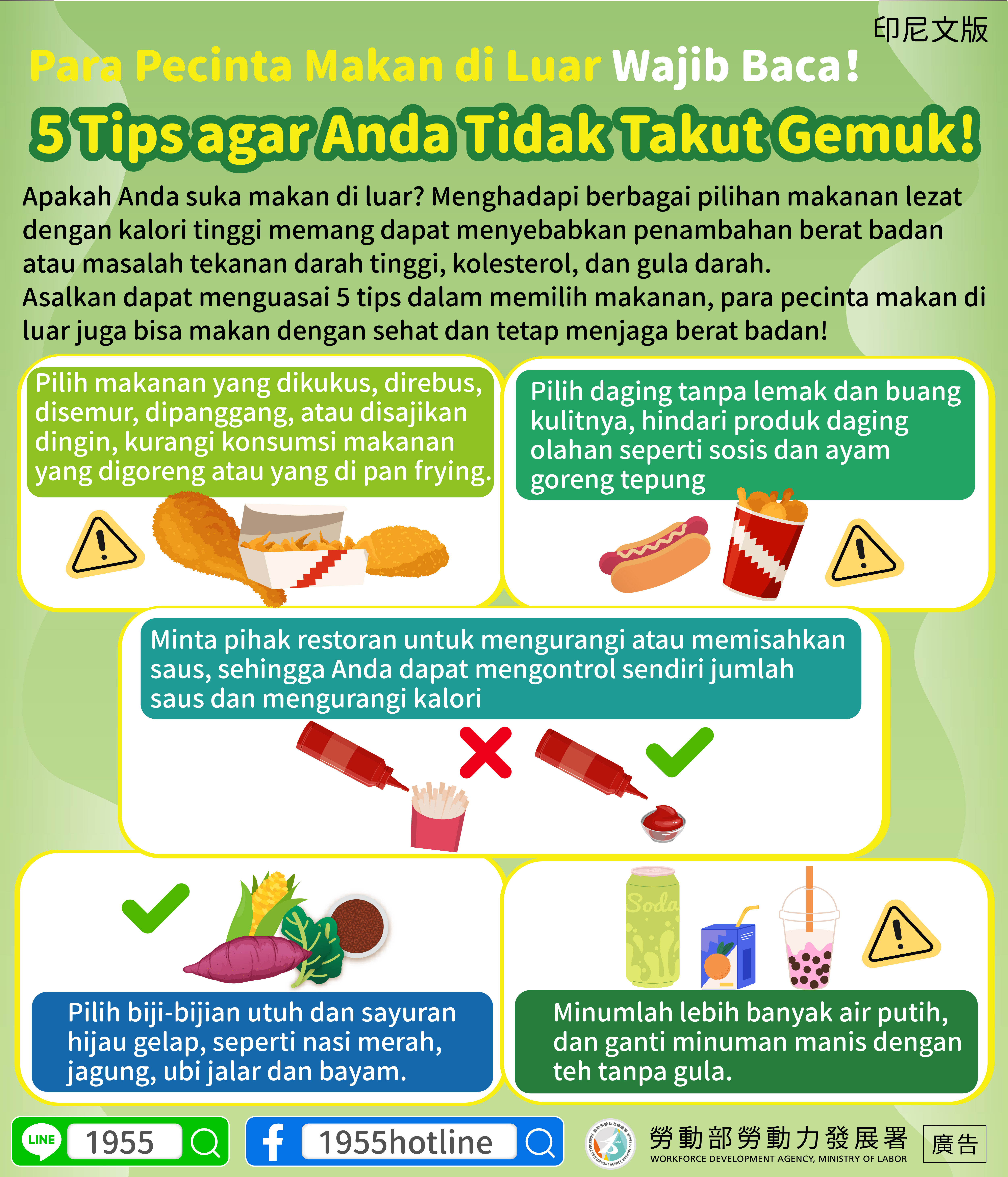 Apakah Anda suka makan di luar? Menghadapi berbagai pilihan makanan lezat dengan kalori tinggi memang dapat menyebabkan penambahan berat badan atau masalah tekanan darah tinggi, kolesterol, dan gula darah. Asalkan dapat menguasai 5 tips dalam memilih makanan, para pecinta makan di luar juga bisa makan dengan sehat dan tetap menjaga berat badan!