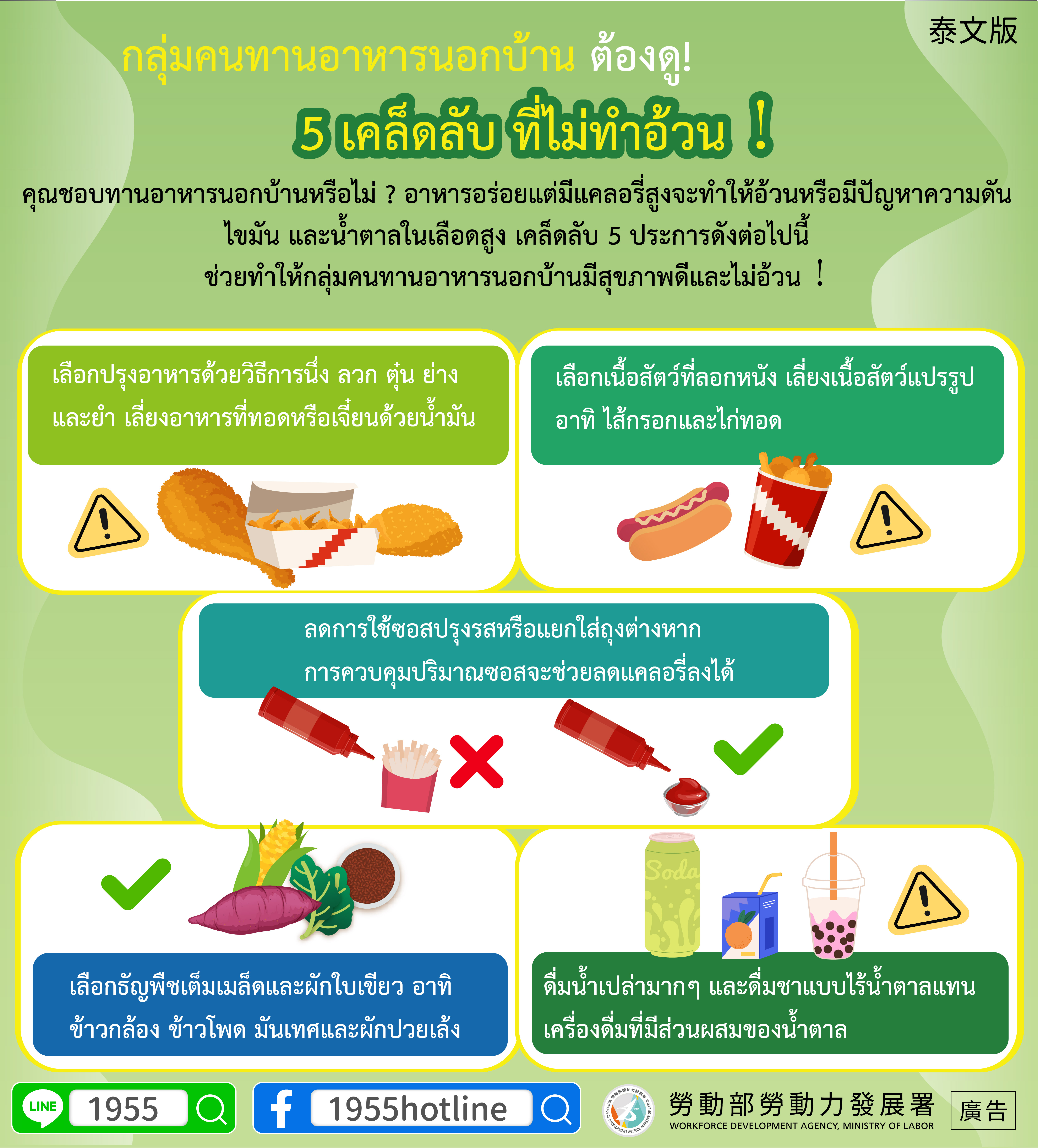 คุณชอบทานอาหารนอกบ้านหรือไม่ ? อาหารอร่อยแต่มีแคลอรี่สูงจะทำให้อ้วนหรือมีปัญหาความดัน ไขมัน และน้ำตาลในเลือดสูง เคล็ดลับ 5 ประการดังต่อไปนี้ ช่วยทำให้กลุ่มคนทานอาหารนอกบ้านมีสุขภาพดีและไม่อ้วน!
