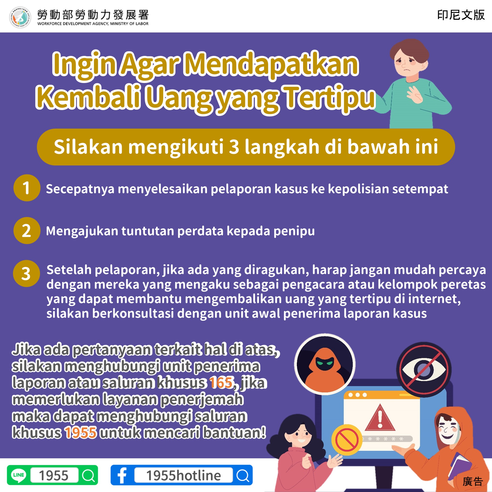 Jika ada pertanyaan terkait hal di atas, silakan menghubungi unit penerima laporan atau saluran khusus 165, jika memerlukan layanan penerjemah maka dapat menghubungi saluran khusus 1955 untuk mencari bantuan!