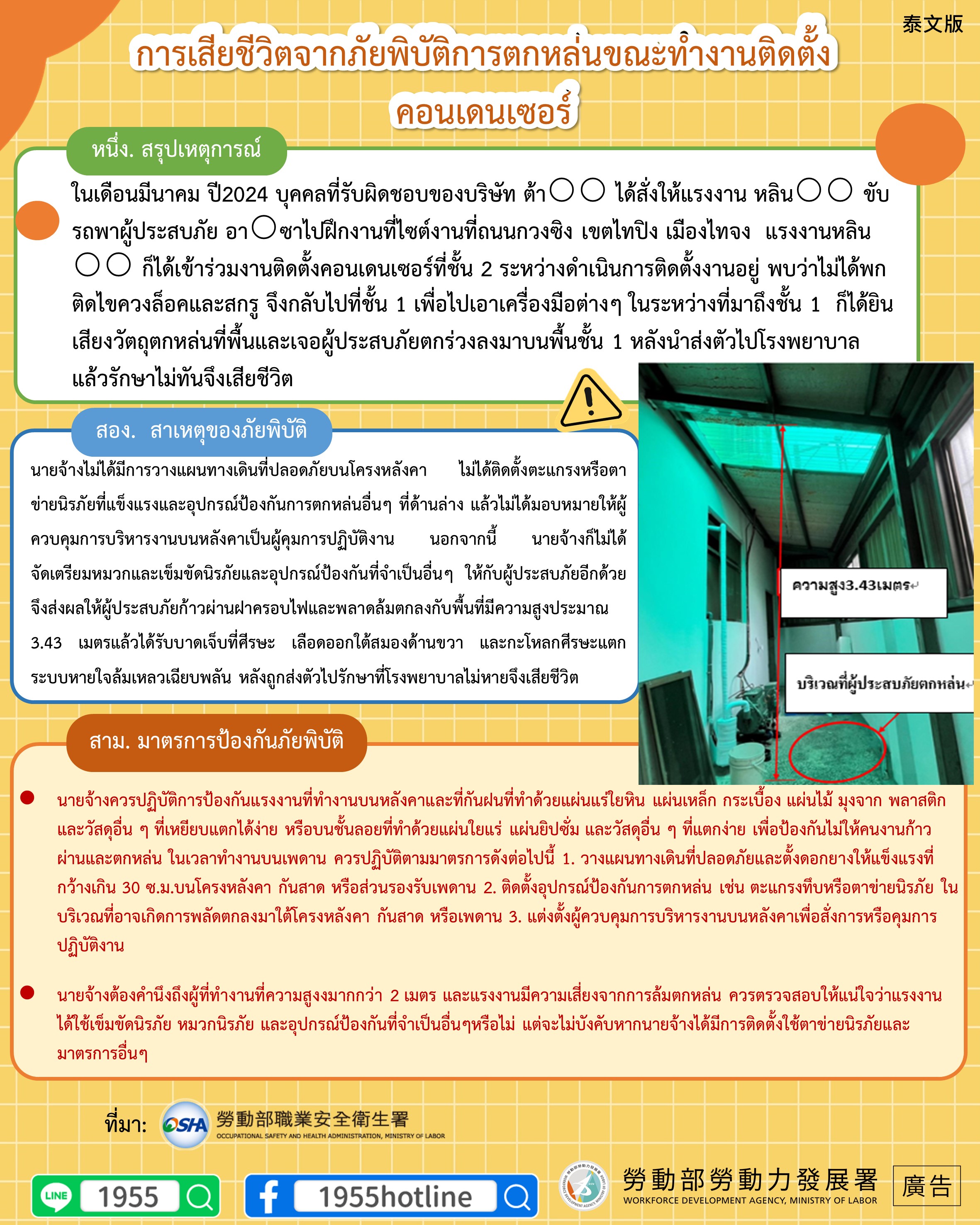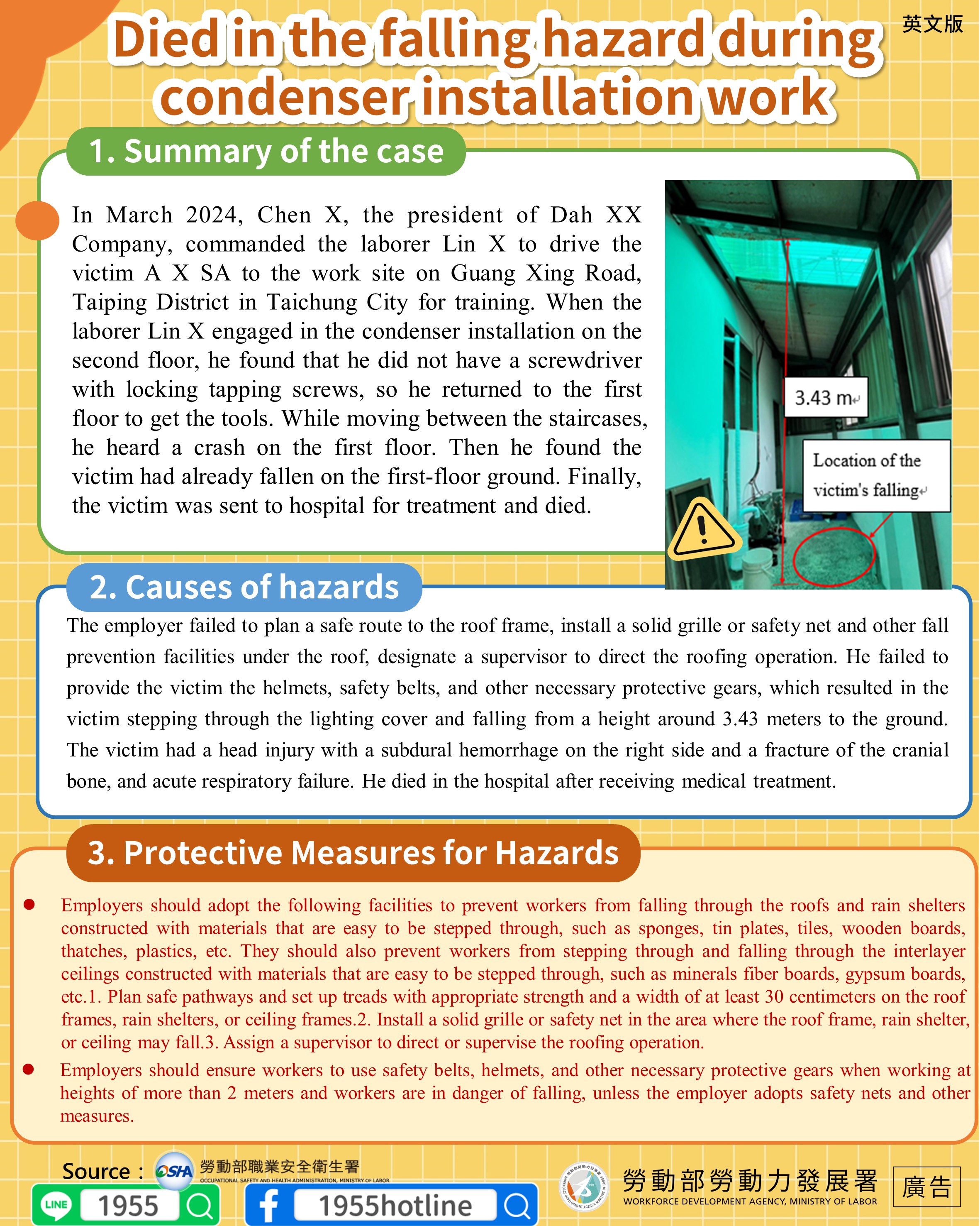ในเดือนมีนาคม ปี2024 บุคคลที่รับผิดชอบของบริษัท ต้า○○ ได้สั่งให้แรงงาน หลิน○○ ขับรถพาผู้ประสบภัย อา○ซาไปฝึกงานที่ไซต์งานที่ถนนกวงซิง เขตไทปิง เมืองไทจง แรงงานหลิน○○ ก็ได้เข้าร่วมงานติดตั้งคอนเดนเซอร์ที่ชั้น 2 ระหว่างดำเนินการติดตั้งงานอยู่ พบว่าไม่ได้พกติดไขควงล็อคและสกรู จึงกลับไปที่ชั้น 1 เพื่อไปเอาเครื่องมือต่างๆ ในระหว่างที่มาถึงชั้น 1 ก็ได้ยินเสียงวัตถุตกหล่นที่พื้นและเจอผู้ประสบภัยตกร่วงลงมาบนพื้นชั้น 1 หลังนำส่งตัวไปโรงพยาบาลแล้วรักษาไม่ทันจึงเสียชีวิต