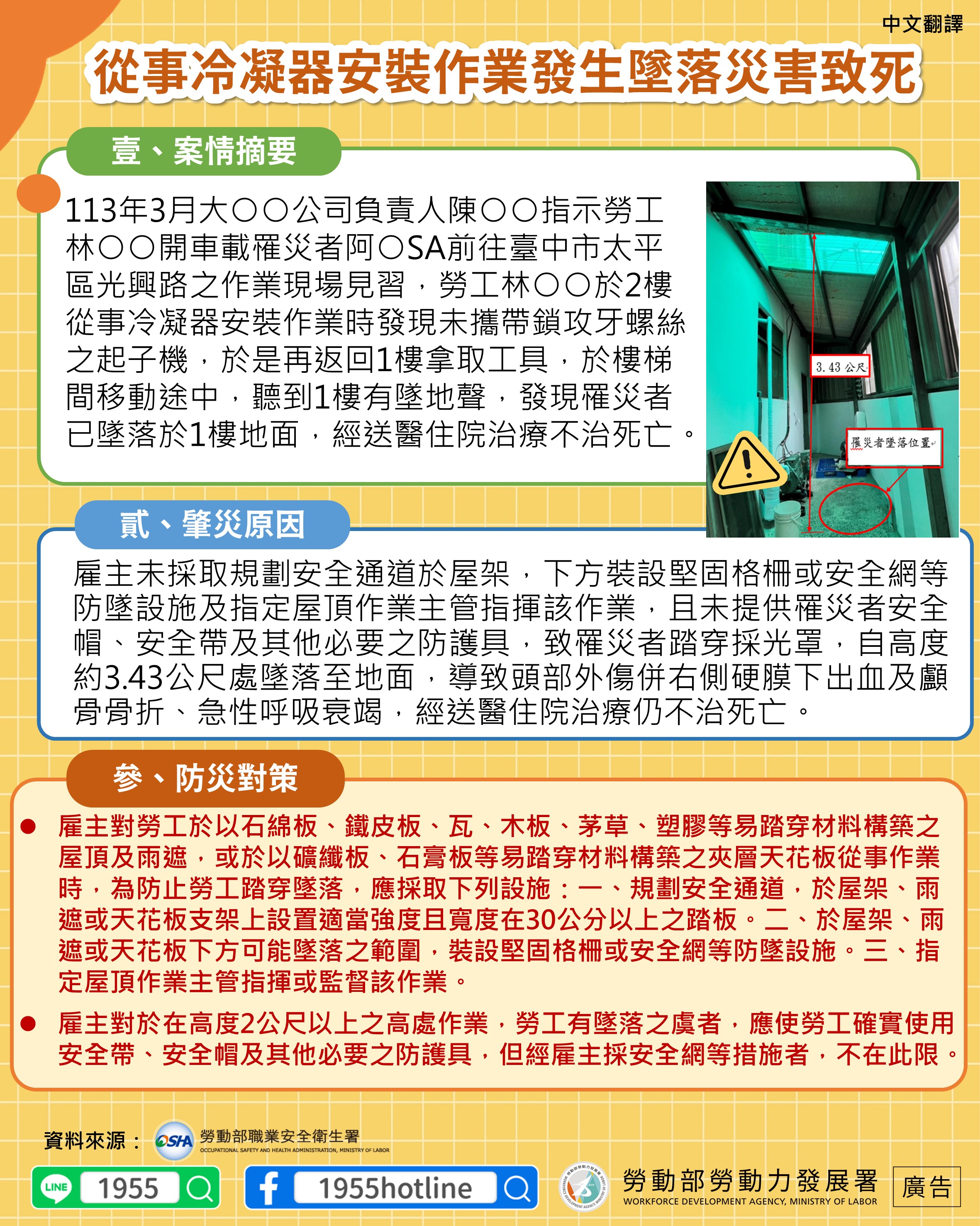(職安署)【從事冷凝器安裝作業發生墜落災害致死】-多國語言版