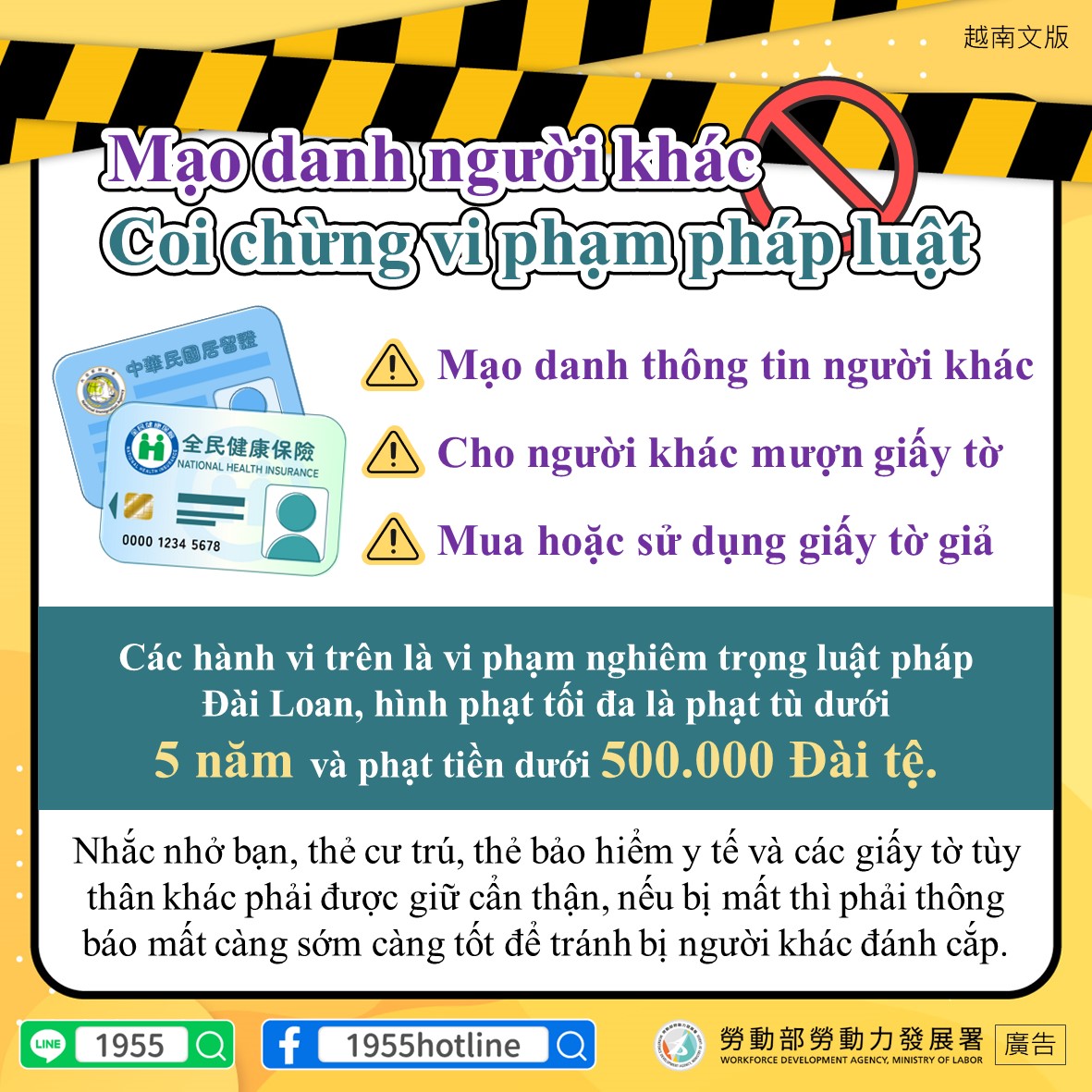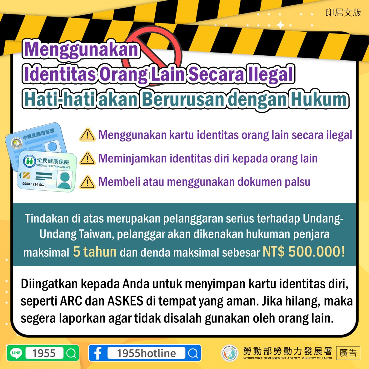 Tindakan di atas merupakan pelanggaran serius terhadap Undang-Undang Taiwan, pelanggar akan dikenakan hukuman penjara maksimal 5 tahun dan denda maksimal sebesar NT$ 500.000!
