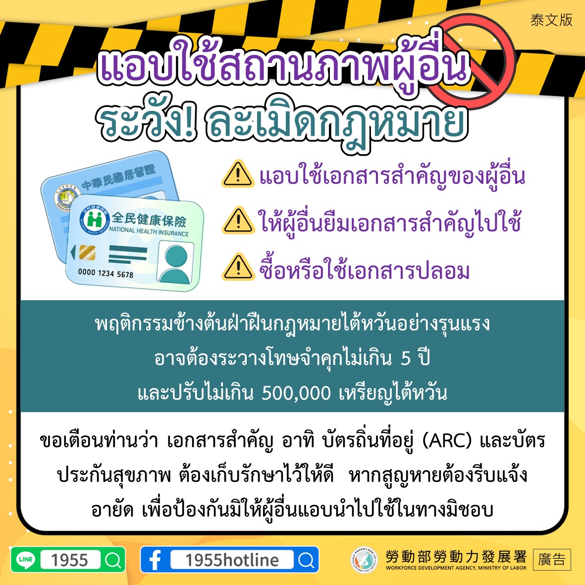 ขอเตือนท่านว่า เอกสารสำคัญ อาทิ บัตรถิ่นที่อยู่ (ARC) และบัตรประกันสุขภาพ ต้องเก็บรักษาไว้ให้ดี หากสูญหายต้องรีบแจ้งอายัด เพื่อป้องกันมิให้ผู้อื่นแอบนำไปใช้ในทางมิชอบ