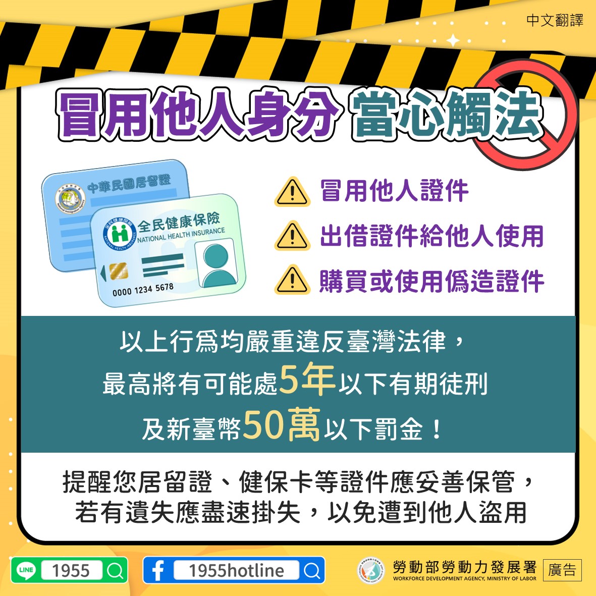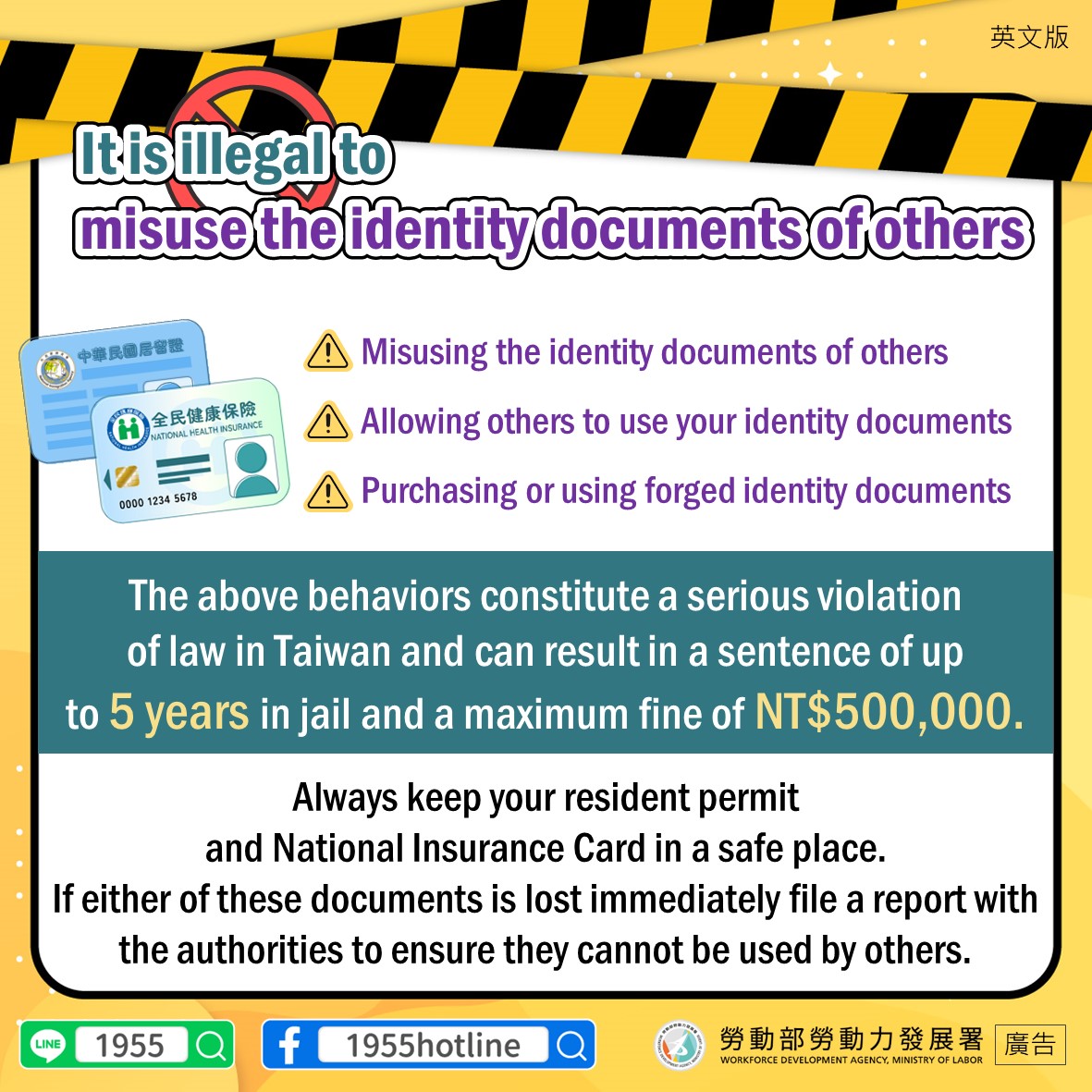 提醒您居留證、健保卡等證件應妥善保管,若有遺失應盡速掛失,以免遭到他人盜用