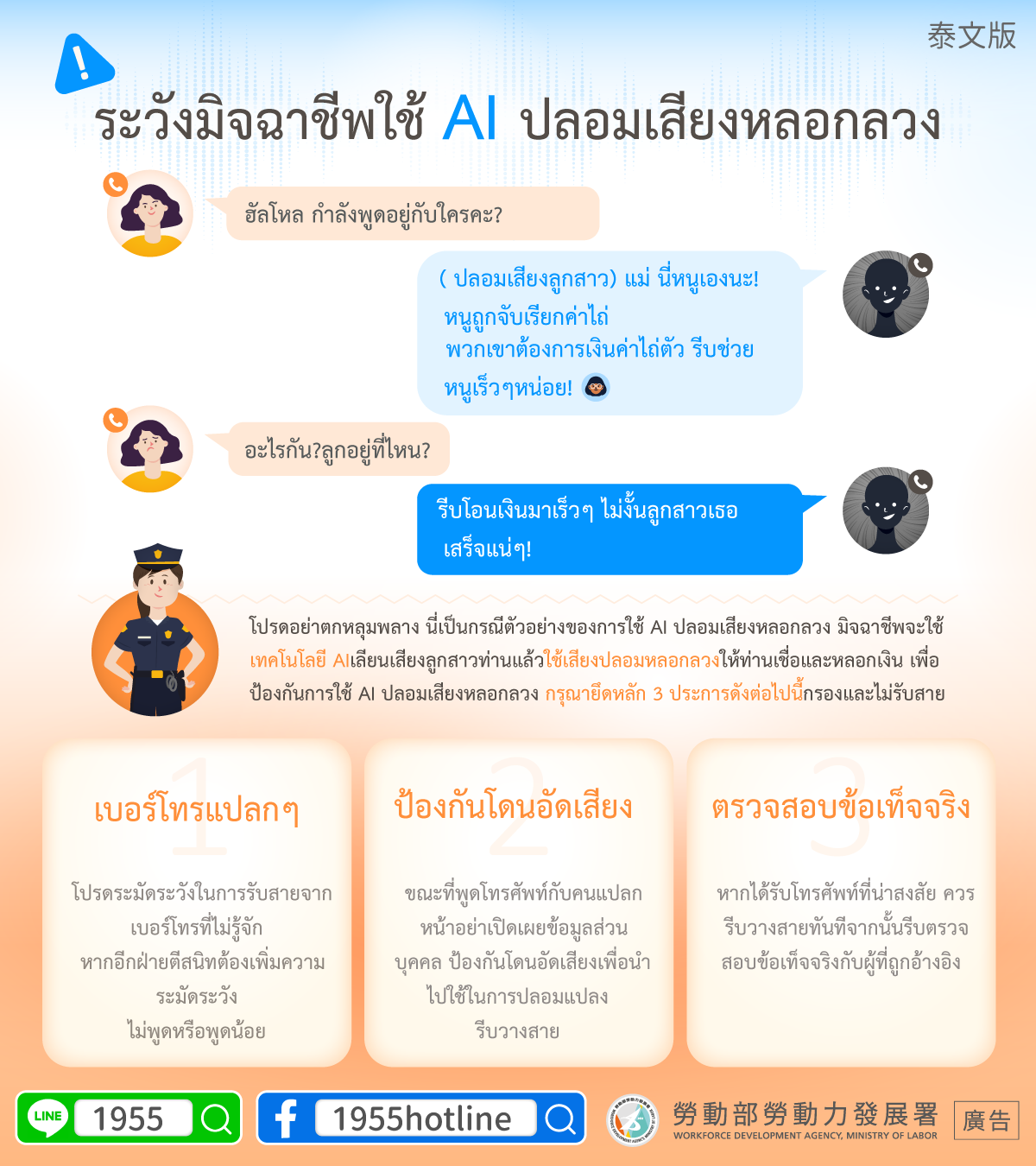 โปรดอย่าตกหลุมพลาง นี่เป็นกรณีตัวอย่างของการใช้ AI ปลอมเสียงหลอกลวง มิจฉาชีพจะใช้เทคโนโลยี AIเลียนเสียงลูกสาวท่านแล้วใช้เสียงปลอมหลอกลวงให้ท่านเชื่อและหลอกเงิน เพื่อป้องกันการใช้ AI ปลอมเสียงหลอกลวง กรุณายึดหลัก 3 ประการดังต่อไปนี้กรองและไม่รับสาย