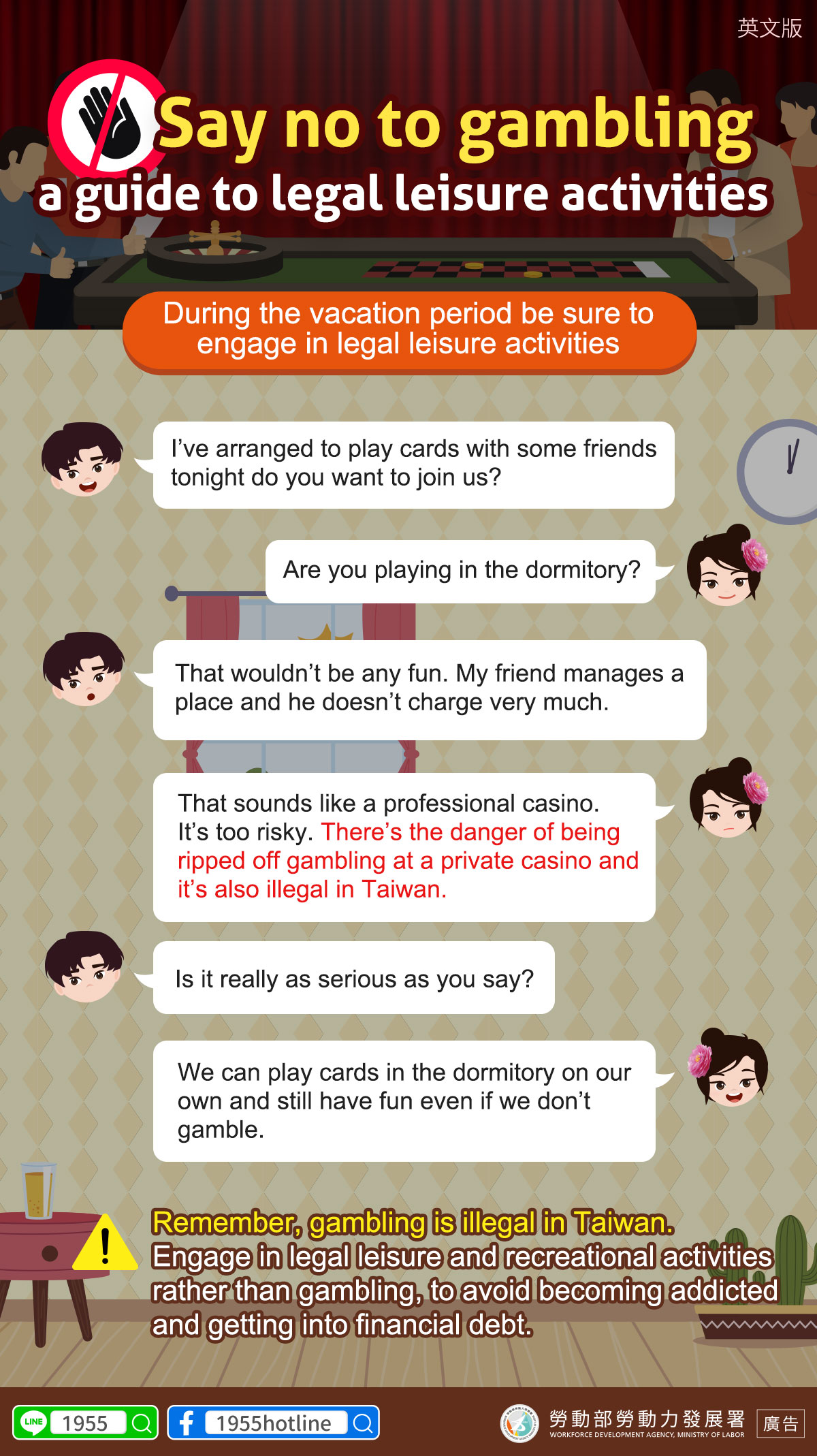 Remember, gambling is illegal in Taiwan. Engage in legal leisure and recreational activities rather than gambling, to avoid becoming addicted and getting into financial debt.