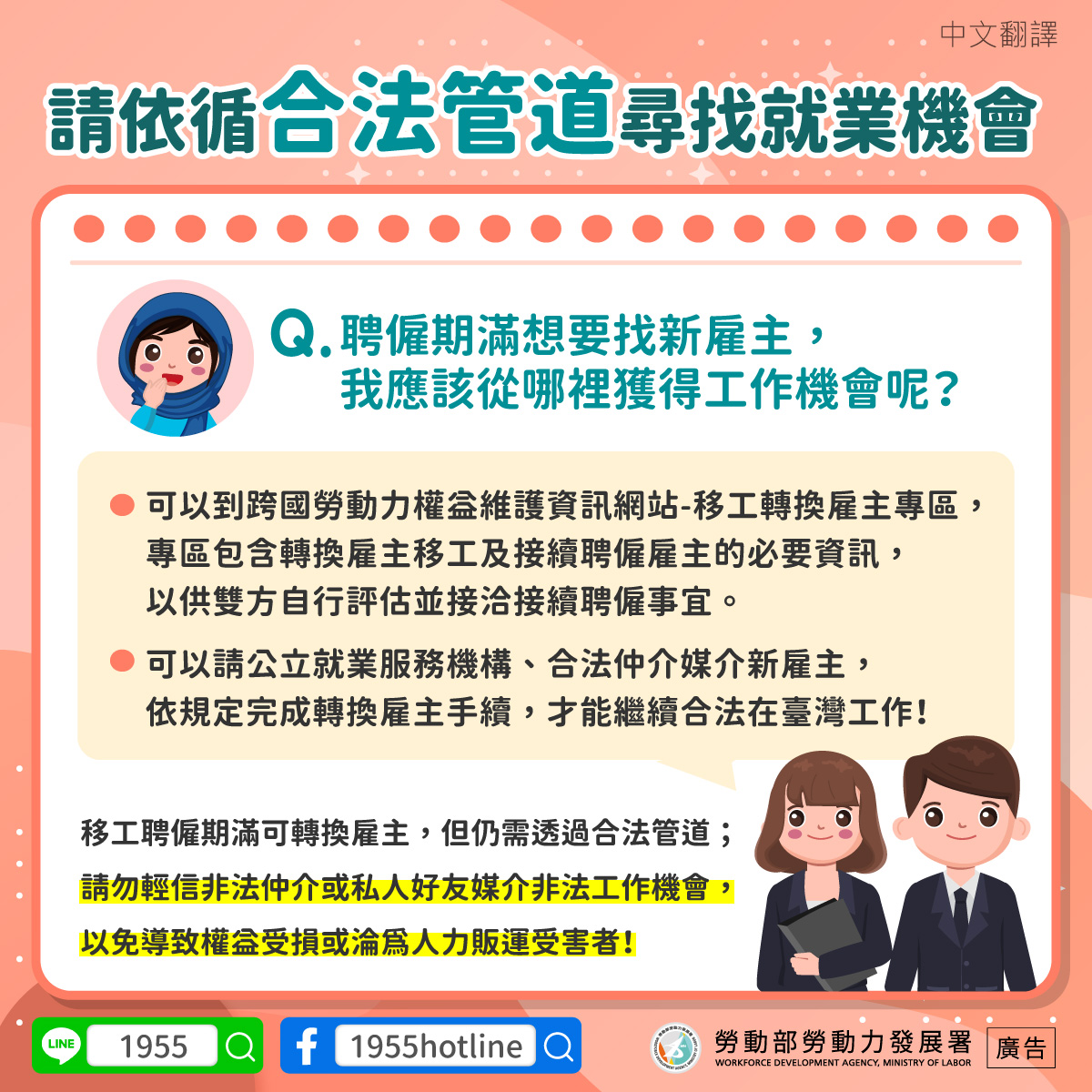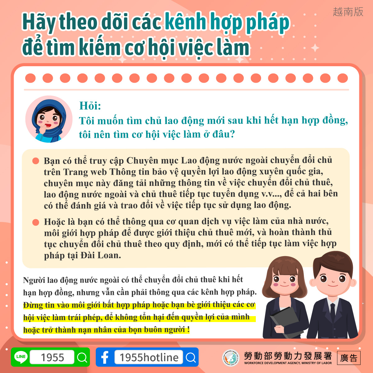 越南文版 ▍Hãy theo dõi các kênh hợp pháp để tìm kiếm cơ hội việc làm Hỏi: Tôi muốn tìm chủ lao động mới sau khi hết hạn hợp đồng, tôi nên tìm cơ hội việc làm ở đâu? Đáp: Bạn có thể truy cập Chuyên mục Lao động nước ngoài chuyển đổi chủ trên Trang web Thông tin bảo vệ quyền lợi lao động xuyên quốc gia, chuyên mục này đăng tải những thông tin về việc chuyển đổi chủ thuê, lao động nước ngoài và chủ thuê tiếp tục tuyển dụng v.v..., để cả hai bên có thể đánh giá và trao đổi về việc tiếp tục sử dụng lao động, hoặc là bạn có thể thông qua cơ quan dịch vụ việc làm của nhà nước, môi giới hợp pháp để được giới thiệu chủ thuê mới, và hoàn thành thủ tục chuyển đổi chủ thuê theo quy định, mới có thể tiếp tục làm việc hợp pháp tại Đài Loan. Người lao động nước ngoài có thể chuyển đổi chủ thuê khi hết hạn hợp đồng, nhưng vẫn cần phải thông qua các kênh hợp pháp. Đừng tin vào môi giới bất hợp pháp hoặc bạn bè giới thiệu các cơ hội việc làm trái phép, để không tổn hại đến quyền lợi của mình hoặc trở thành nạn nhân của bọn buôn người !