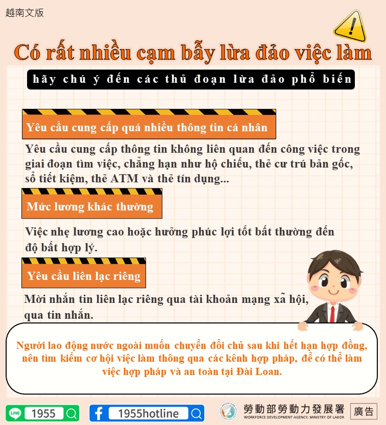 Người lao động nước ngoài muốn chuyển đổi chủ sau khi hết hạn hợp đồng, nên tìm kiếm cơ hội việc làm thông qua các kênh hợp pháp, để có thể làm việc hợp pháp và an toàn tại Đài Loan.