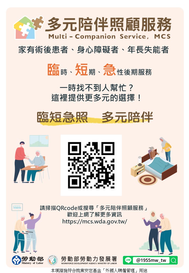 勞動部「多元陪伴照顧服務試辦計畫」在今(4/7)日正式上路,目前全國北、中、南、東共有6家公益團體提供服務,開放官網線上預約全額自費服務(https://mcs.wda.gov.tw/)。如果家中有突發狀況需要幫手陪伴照顧,可立即提出申請,期藉由提供彈性、多元服務使勞動者安心就業,不因照顧家人而退離職場。